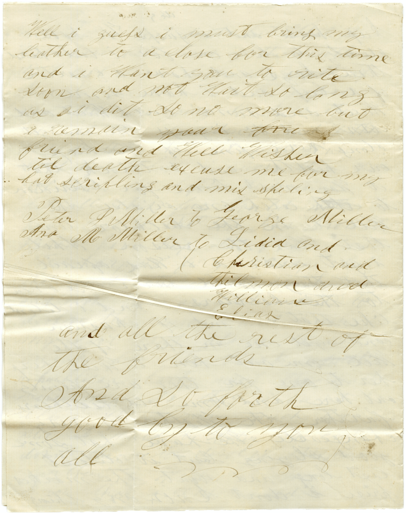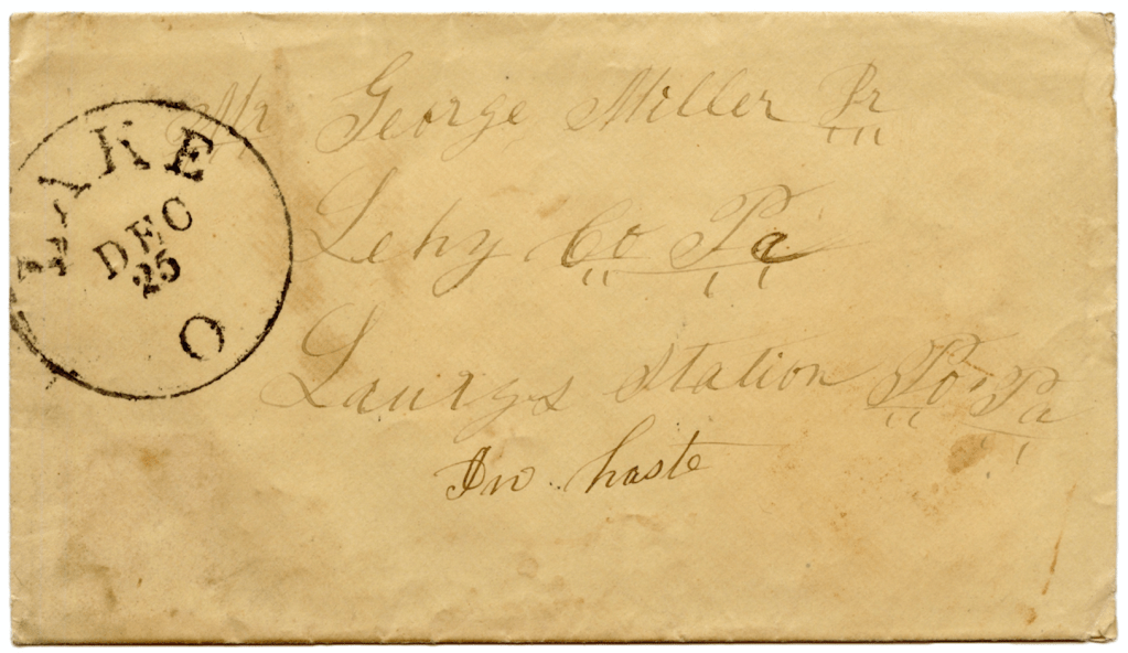 Peter wrote the letter to his uncle George Miller (1804-1867) who was married to Lydia Newhard (1811-1890). George and Lydia had several children, to include: Christianna (b. 1837), Tilghman P. (b. 1939), William (b. 1841), Eli (b. 1844), and Peter (b. 1849). The couple lived out their days there, raising at least seven children.