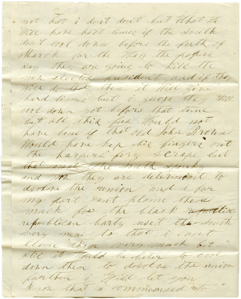 And there is a great excitement about the President that was elected. Some are almost scared to death while others only laugh at them. But for my part, I didn’t lose any sleep about it yet. But I don’t know but what we will have hard times if the South don’t cool down before the fourth of March for the way the papers say, they are going to kill the new[ly] elected President and if they will do that, then it will give hard times. But I guess they will cool down yet before that time. But all this fuss would not have been if that Old John Brown would have kept his fingers out of the Harper’s Ferry scrape. But that made the South spunky and now they are determined to dissolve the Union, and I, for my part, can’t blame them much for the black republican party used the South very mean so that I can’t blame them very much. But still it would be better to cool down than to dissolve the Union.
