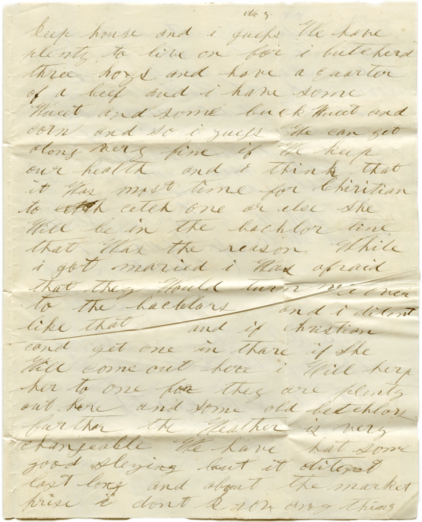 Further, I will let you know that I commenced to keep house and I guess we have plenty to live on for I butchered three hogs and have a quarter of a beef and I have some wheat and some buckwheat and corn. And so I guess we can get along very fine if we keep our health. And I think that it was most time for Christian[na] to catch one or else she will be in the bachelor line. That was the reason why I got married. I was afraid that they would turn me over to the bachelors and I didn’t like that. And if Christian[na] can get one in there if she will come out here, I will help her to [find] one for they are plenty here—and some old bachelors [too].
