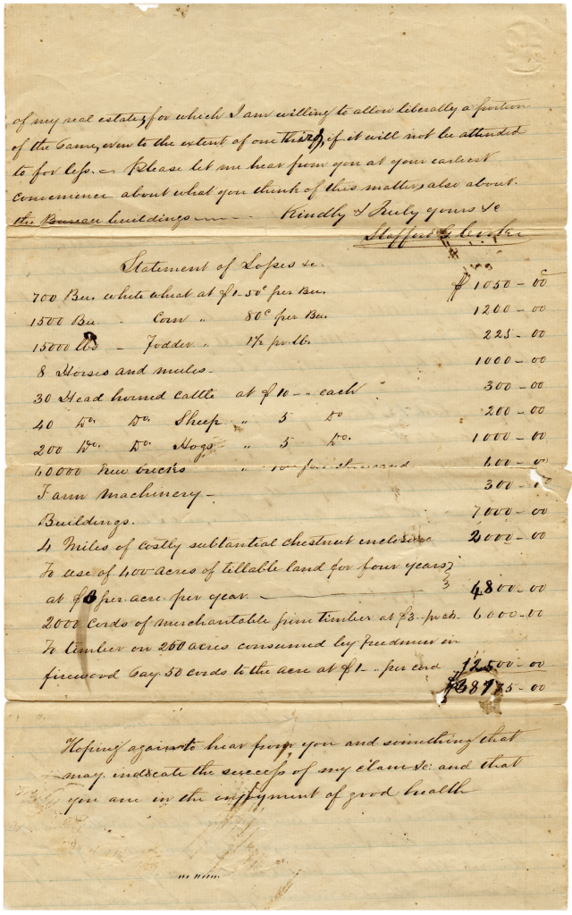 You will also find a subjoined statement of the items of my losses and what I consider to be their respective valuations, but should you consider any estimate of mine too large or small, you can alter the same to what may be regarded as right and proper. I have now, my dear friend, given you a true statement of this matter and said nothing more than I can prove, and hope you will put forth your strongest efforts, and give me the benefit of all your influence to get something allowed as indemnity for my losses—use and injury of my real estate—for which I am willing to allow liberally a portion of the same, even to the extent of one-third if it will not be attended to for less. Please let me hear from you at your earliest convenience about what you think of this matter. Also about the Bureau buildings.