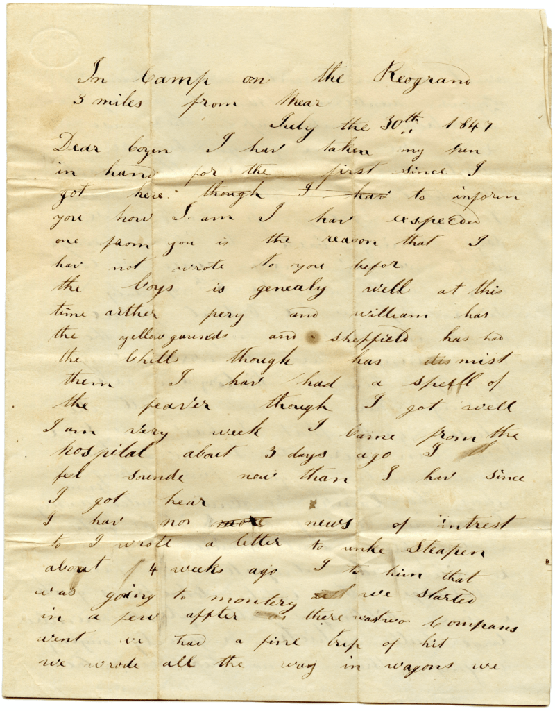 These two Mexican War letters were written by John L. Sample (1825-Bef1852) who enlisted in Co. B, 16th US Infantry in April 1847 and was discharged on 7 August 1848. He was described at that time as standing 5 foot 10 inches tall, with blue eyes and dark hair.