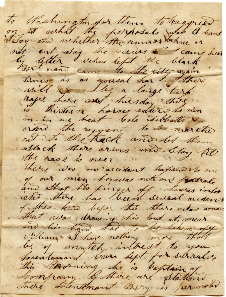 We have left the black Fort and come to the city again. Times is as usual here. There will be a large turf race here next Tuesday. There is thirteen horses entered to run in one heat. Col. [John Wooleston] Tibbatts ordered the regiment marched out to the track and let them stack arms and stay till the race is over.