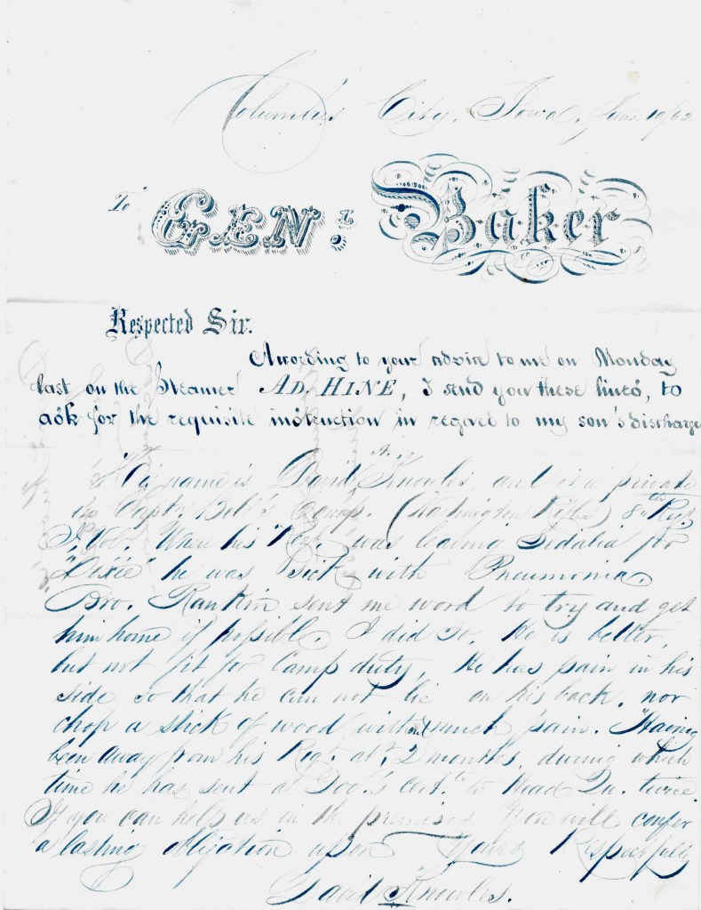 This letter was written by Rev. David Knowles (1811-1899) of Columbus City, Iowa, in June 1862. In his letter, David requests the assistance of “Gen. Baker” in securing a discharge for his son serving in Co. C, 8th Iowa Infantry. His son was David A. Knowles (1843-1863) enlisted on 10 August 1861. He died at Jefferson Barracks in St. Louis on 6 August 1863.