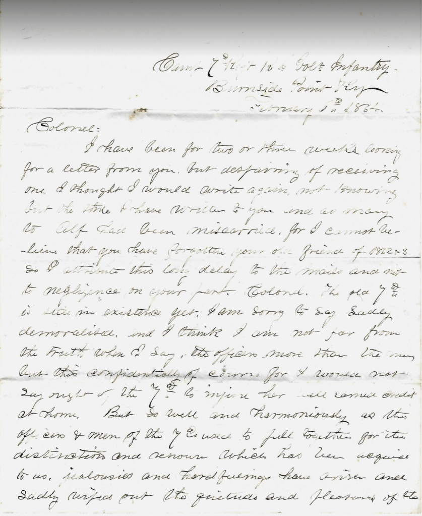 Colonel, the Old 7th is still in existence yet—I am sorry to say sadly demoralized—and I think I am not far from the truth when I say the officers more than the men. But this confidentially of course for I would not say ought of the 7th to injure her well earned credit at home. But so well and harmoniously as the officers and men of the 7th used to pull together for the distinction and renown which has been acquired to us, jealousies and hard feelings now arise and sadly wiped out the quietude and pleasures of the little band. “H_____” that now compose our thinned and decimated ranks ranks.