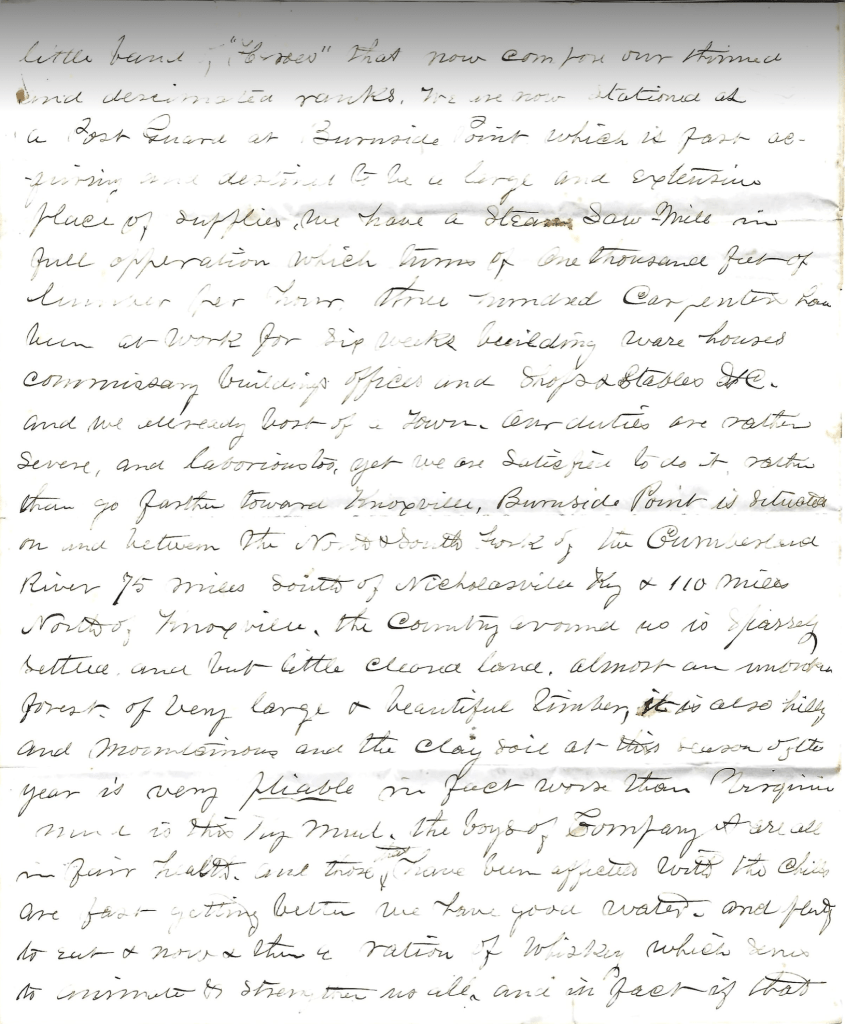 We are now stationed as a Post Guard at Burnside Point 1 which is fast acquiring and destined to be a large and extensive place of supplies. We have a steam sawmill in full operation which turns off one thousand feet of lumber per our. Three hundred carpenters have been at work for six weeks building warehouses, commissary buildings, offices, and shops & stables, &c., and we already boast of a town. Our duties are rather severe and laborious too, yet we are satisfied to do it rather than go farther toward Knoxville. Burnside Point is situated on and between the North & South Fork of the Cumberland River 75 miles south of Nicholasville, Kentucky, and 110 miles north of Knoxville. The country around us is sparsely settled and but little cleared land—almost an unbroken forest of very large and beautiful timber. It is also hilly and mountainous and the clay soil at this season of the year is very pliable. In fact, worse than Virginia.