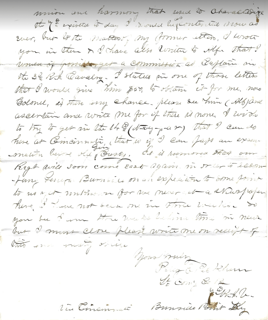 But to the matter of my former letters, I wrote you in them & I have also written to Alf that I would, if possible, get a commission as captain in the 3rd Rhode Island Cavalry. I stated in one of those letters that I would give him $50 to obtain it for me. Now Colonel, is there any chance? Please see him (Alf) and ascertain and write me for if there is none, I wish to try to get in the 14th (N-i-g-g-e-r). That I can do here at Cincinnati—that is, if I can pass an examination before Old Gen. [Silas] Casey. It is rumored that our regiment will soon come East again in order to accompany General Burnside on an expedition to some point to us yet unknown for we never get a newspaper here. I have not seen one in three weeks so you see I am three weeks behind time in new.