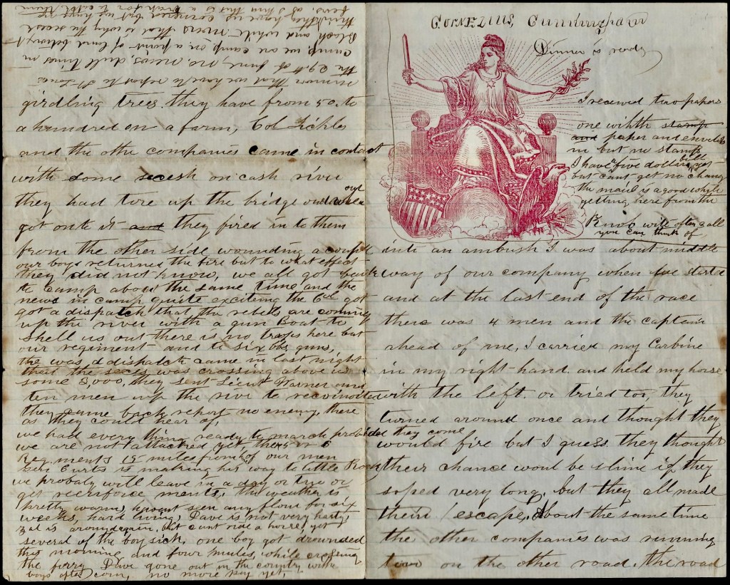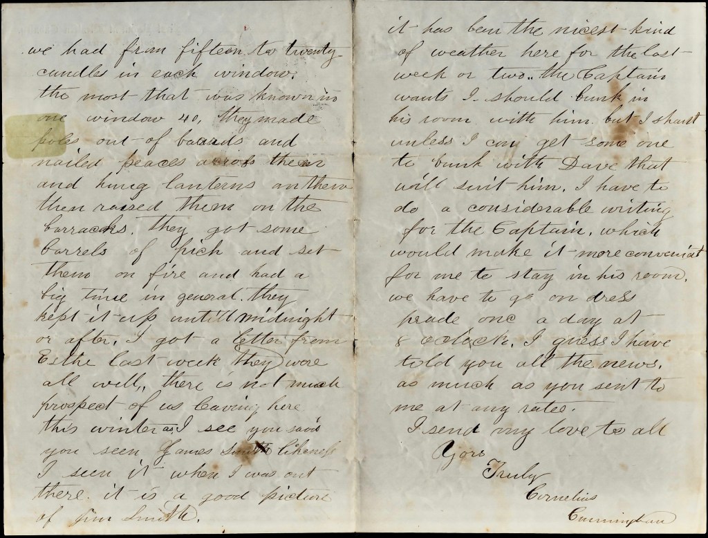 Daniel Miller is in the guard house yet. I do not know what his sentence is, nor he don’t. I have been looking for a letter for a day or two past, but have not seen any. I should think between some of you, you might write once a week as you have more time to write than I have. I tell you, we have not much leisure time, Sundays not excepted. Write soon. When this you see, remember me, though many miles apart we be. — Cornelius Cunningham