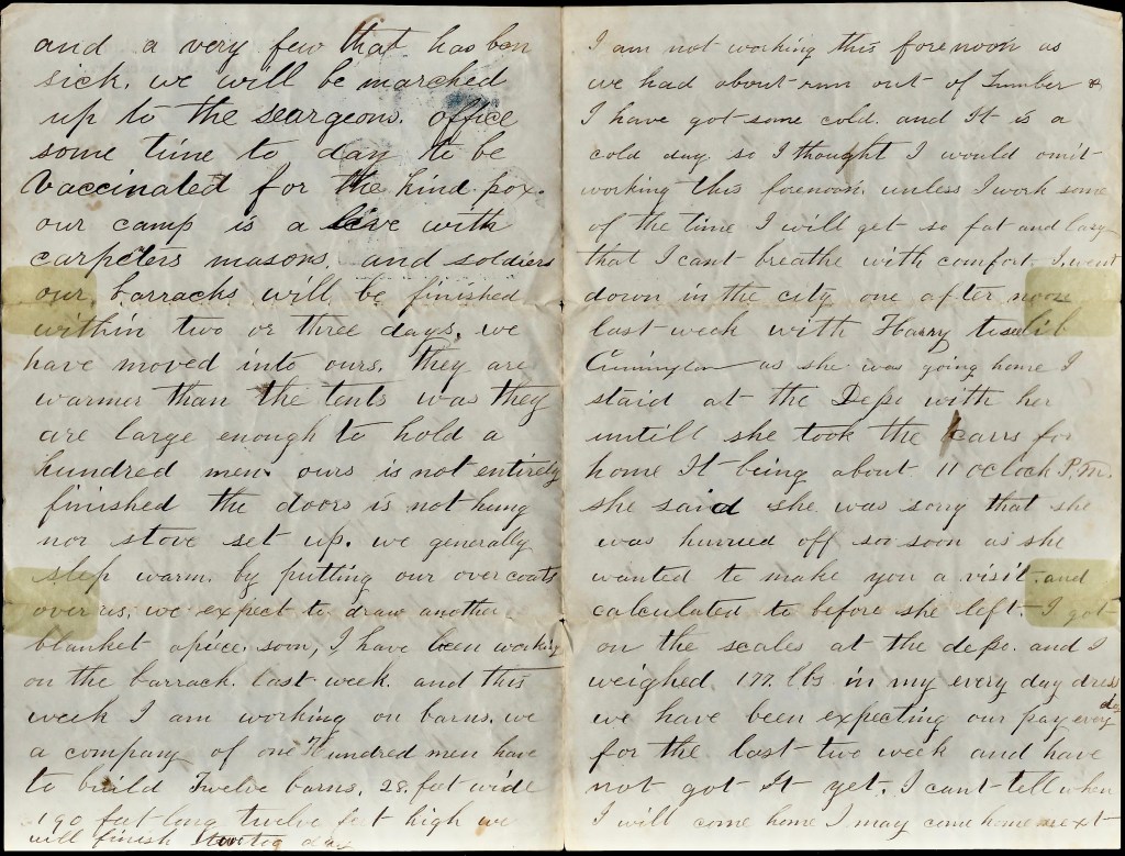 Our camp is alive with carpenters, masons, and soldiers. Our barracks will be finished within two or three days. We have moved into ours. They are warmer than the tents was. They are large enough to hold a hundred men. Ours is not entirely finished. The doors is not hung nor stove set up. We generally sleep warm by putting our overcoats over us. We expect to draw another blanket apiece soon. I have been working on the barracks last week and this week I am working on barns. We—a company of one hundred men—have to build twelve barns 28 feet wide, 190 feet long, twelve feet high. We will finish two today.