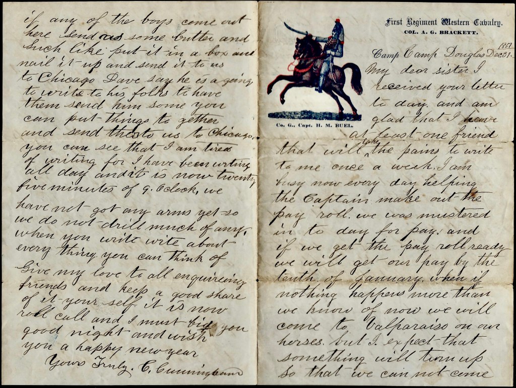 I received your letter today and am glad that I have at least one friend that will take the pains to write to me once a week. I am busy now every day helping the captain make out the pay roll. We was mustered in today for pay and if we get the pay roll ready, we will get our pay by the tenth of January when, if nothing happens more than we know of now, we will come to Valparaiso on our horses. But I expect that something will turn up so that we cannot come.
