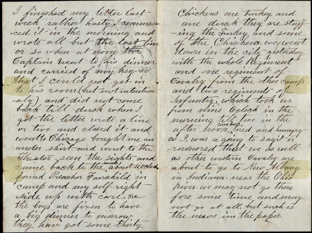 I finished my letter last week rather hasty. I commenced it in the morning and wrote all but the last line or so when at noon the captain went to his dinner and carried off my key so that I could not get into his room (but not intentionally) and did not come back till dusk when I got the letter, wrote a line or two, and closed it and went to Chicago, bought me an under shirt, and went to the theater. Seen the sights and came back to the barracks about 11 o’clock. Found Preacher Fairchild in camp and myself right side up with care, &c. The boys are fixin’ to have a big dinner tomorrow. They have got some thirty chickens, one turkey, and one duck. They are stuffing the turkey and some of the chickens. We went down in the city yesterday with the whole regiment and one regiment of cavalry from the other camp and two regiments of infantry which took us from nine o’clock in the morning till two in the afternoon. Came back tired and hungry as I was a going to say.