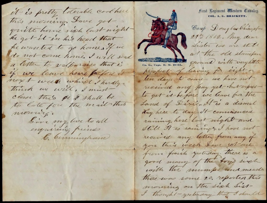 These letters were written by Cornelius Cunningham (1837-1862), the son of Horace Cunningham (1781-1882) and Caroline Elizabeth Tree (1810-1880) of Valparaiso, Porter county, Indiana. Cornelius died of disease on 25 August 1862 at Helena, Arkansas, while serving in Co. G, 9th Illinois Cavalry.