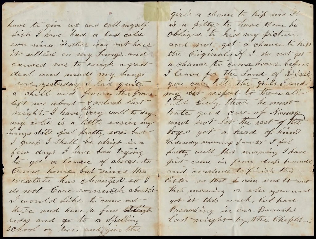 I have not received any letter from any of you this week. Dave got one from Josiah yesterday. There is a good many of the boys sick with the mumps and measles. There was some 20 reported this morning on the sick list. I thought yesterday that I should have to give up and call myself sick. I have had a bad cold ever since Father was out here. It settled on my lungs and caused me to cough a great deal and made my lungs sore. Yesterday I had quite a chill and fever. The fever left me about 8 o’clock last night. I have felt very well today. My cold is a little easier. My lungs still feel pretty sore but I guess I shall be alright in a few days. I have been trying to get a leave of absence to come home but since the weather has changed so I do not care so much about it. I would like to come out there and have a few sleigh rides and go to a spelling school or two, and give the girls a chance to kiss me. It is a pity to have them obliged to kiss my picture and not get a chance to kiss the original. If I do not get a chance to come home before I leave for the Land of Dixie, you can tell the girls I send my best respects to them all.