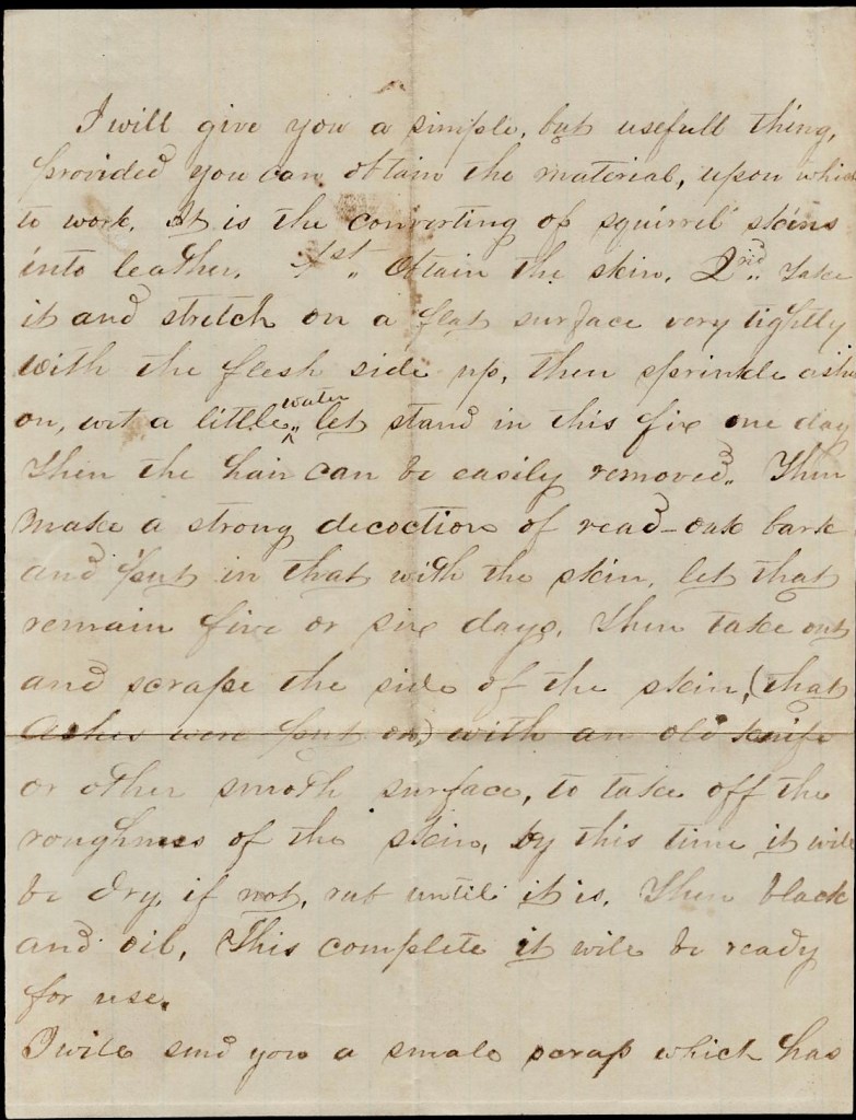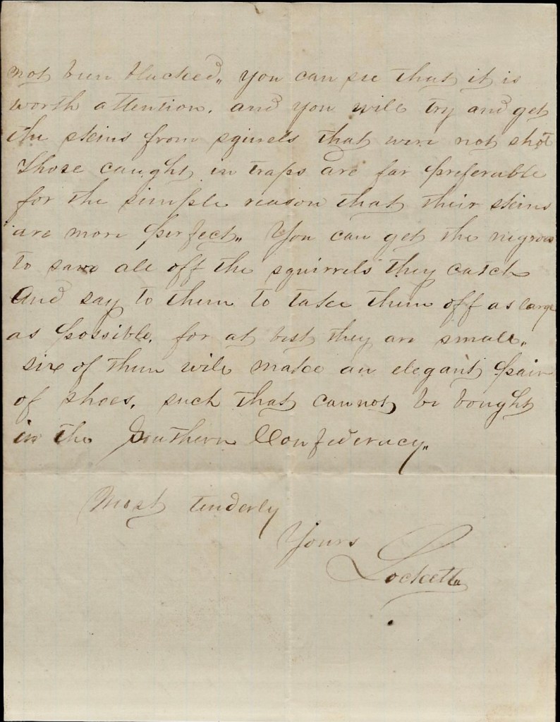 [There is an attached document that I did not transcribe describing the skinning of squirrels. It ends with thee following; “Try to get the skins from squirrels that were not shot. Those caught in traps are far preferable for the simple reason that their skins are more perfect. You can get the negroes to save all the squirrels they catch and say to them to take them off as large as possible for at best they are small. Six of them will make an elegant pair of shoes such that cannot be bought in the Southern Confederacy.“]