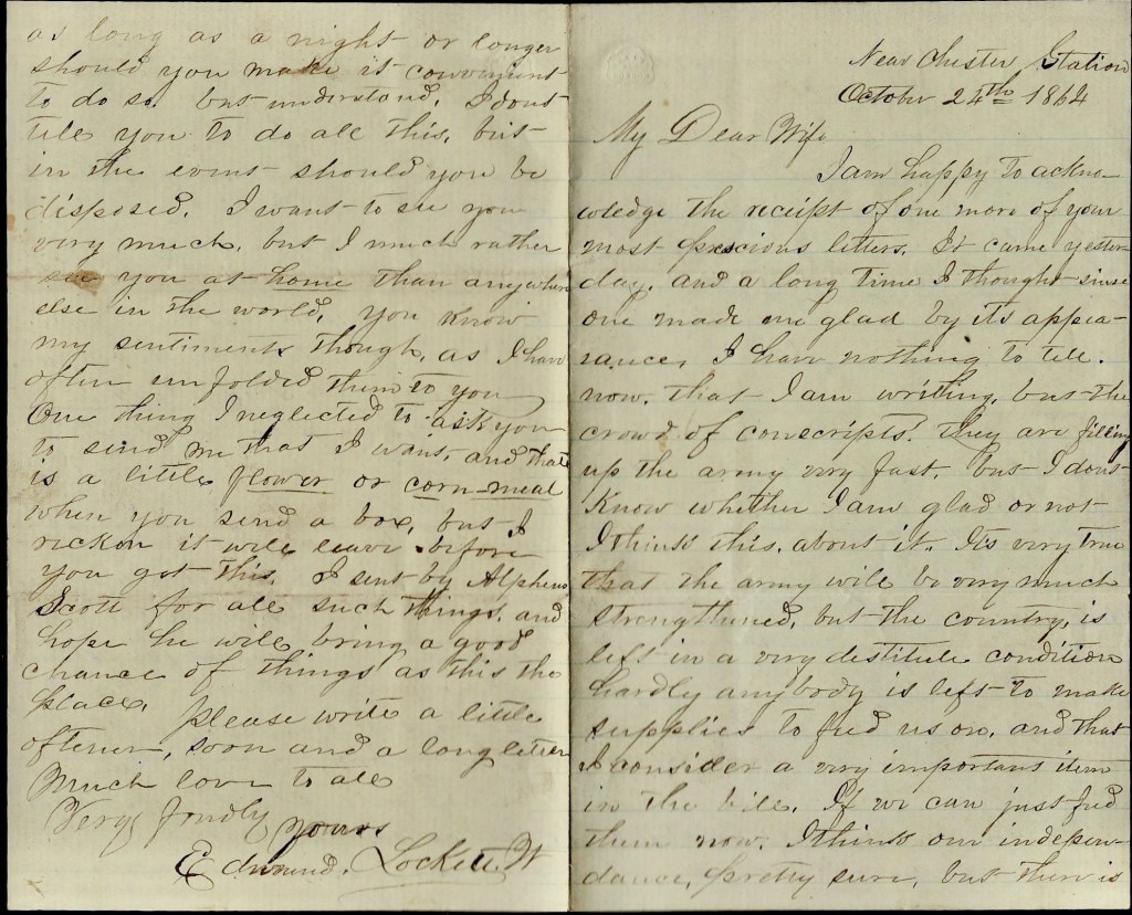 I am happy to acknowledge the receipt of one more of your most precious letters. It came yesterday and a long time I thought since one made me glad by its appearance. I have nothing to tell now that I am writing but the crowd of conscripts—they are filling up the army very fast but I don’t know whether I am glad or not. I think this about it. It’s very true that the army wil be very much strengthened, but the country is left in a very destitute condition—hardly anybody is left to make supplies to feed us on, and that I consider a very important item in the bill. If we can just feed them now, I think our independence [may come] pretty soon, but there is great fears entertained in respect to the negroes destroying what has already been made and then again of their not making much more as there are but very few men left and they old men. Though we can only hope for the best should the worst come.