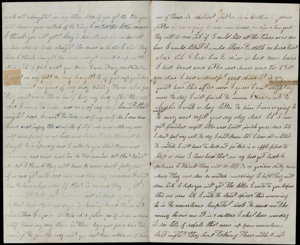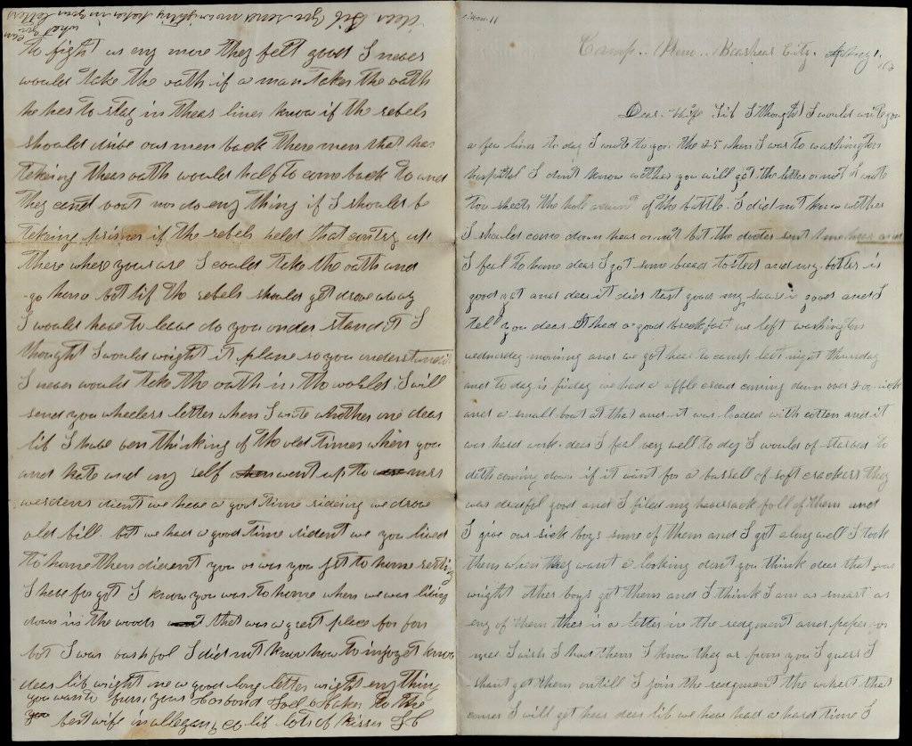 Dear Lib, I hope you will get the letter I wrote to you before this one. Dear Lib, I wrote to Corp. [Daniel T.] Spicer this morning—he is to New Orleans Hospital sick—to send me the money he owes me. It is 9 dollars. I shall hear Monday. I see lots of rebels that come up from New Orleans last night. They had taken the oath to not fight us any more. They felt good. I never would take the oath. If a man takes the oath, he has to stay in their lines. Now if the rebels should drive our men back, their men that has taken the oath would have to come back too and they can’t vote nor do anything. If I should be taken prisoner if the rebels held that country up there where you are, I could take the oath and go home but if the rebels should get drove away, I would have to leave. do you understand? I thought I would write it plain so you understand it. I never would take the oath in the world.