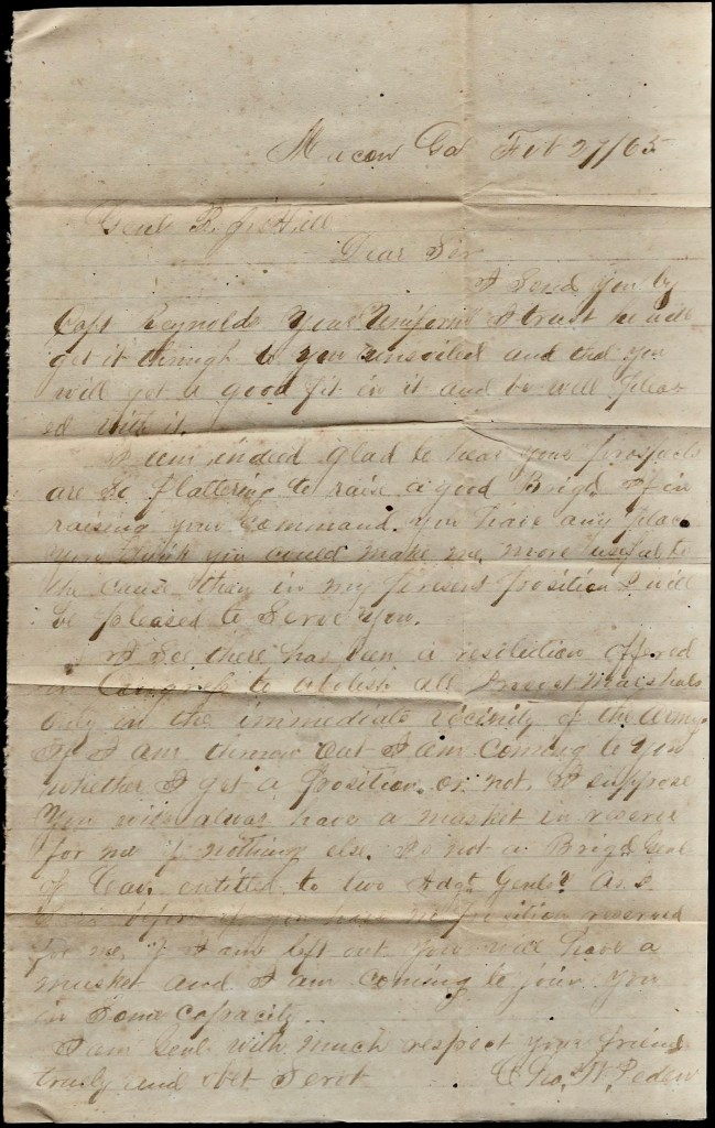 This letter was written by Capt. Charles Wesley Peden (1834-1889) who began his service in the Confederate army as a 1st Lt. of the Rock City Volunteers, but beginning in April 1862 he became a Provost Marshal and filled posts for various lengths of time in Corinth (MS), Tullahoma (TN), Shelbyville (TN), Chattanooga (TN), and Atlanta (Ga). With the fall of Atlanta in September 1864, Capt. Peden’s Provost Marshal’s office was relocated to the Macon Arsenal in Macon, Georgia, where he wrote this letter. Macon was a center of textile manufacturing and supplied cloth for officer’s uniforms and other needs of the Confederate army.
