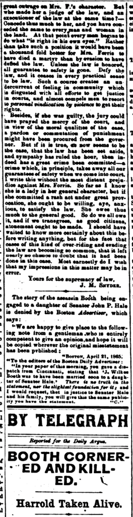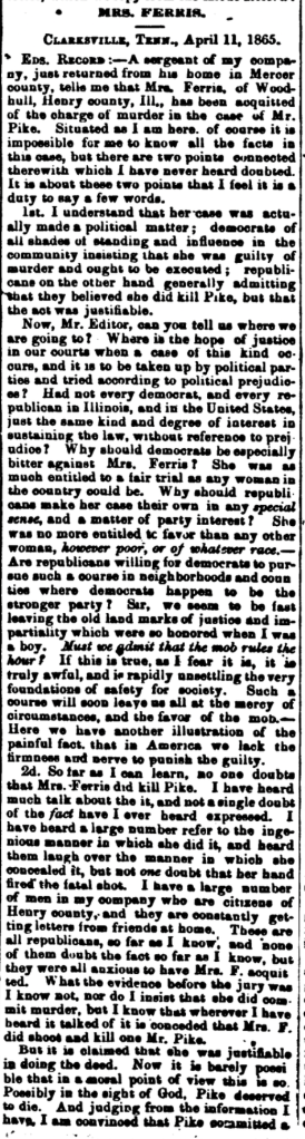 Benjamin has got home from court. That woman Mrs. [Mary] Ferris who shot William Pike had her trial. 3 It occupied nine days. She was cleared. I suppose you heard of the prisoners breaking jail about four weeks before court time. They had caught two but the two that was in for murder, they have not yet been found. There were Irishmen. They killed a man in Annawan.