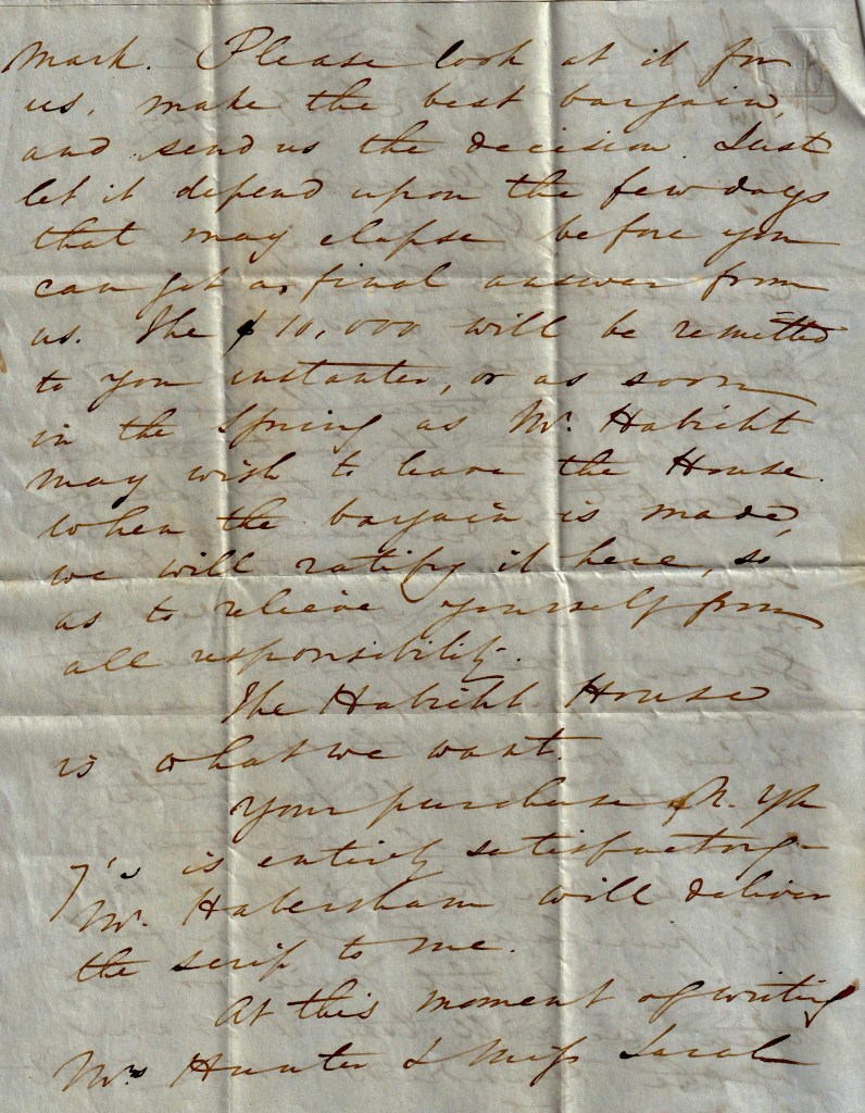 The ladies send you a thousand thanks for the House notices, and for your orders to Genoa. We adopt at once the offer of Mr. Habricht’s house, if it has water, bathes, &c., as you suggest. We will pay the amount in cash, whatever it may be. You think $10,000 will not purchase it. If you fail to get it at that price, for cash, then, we will take it at any of the hundreds above that mark. Please look at it for us—make the best bargain—and send us the decision. Just let it depend upon the few days that may elapse before you can get a final answer from us. The $10,000 will be remitted to you instanter, or as soon in the Spring as Mr. Habricht may wish to leave the house when the bargain is made. We will ratify it here so as to relieve yourself from all responsibility. The Habricht House is what we want.