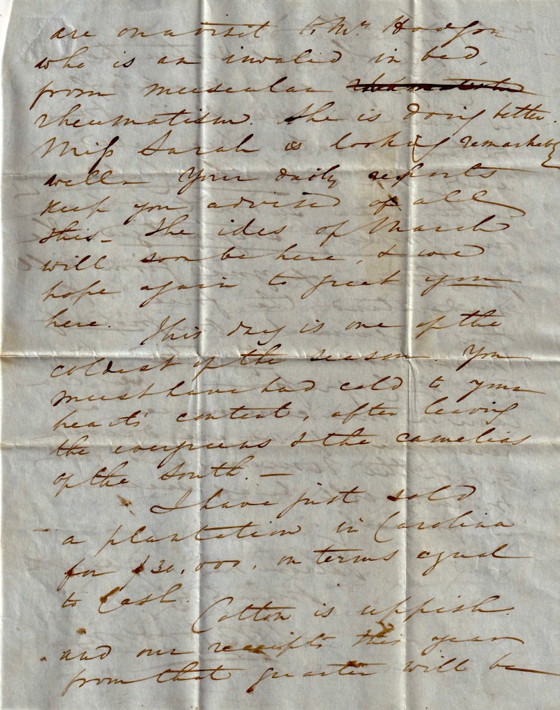This day is one of the coldest of the season. You must have had cold to your heart’s content, after leaving the evergreens and the camellias of the South. I have just sold a plantation in Carolina for $30,000, on terms equal to cash. Cotton is uppish and our receipts this year from that quarter will be very favorable.