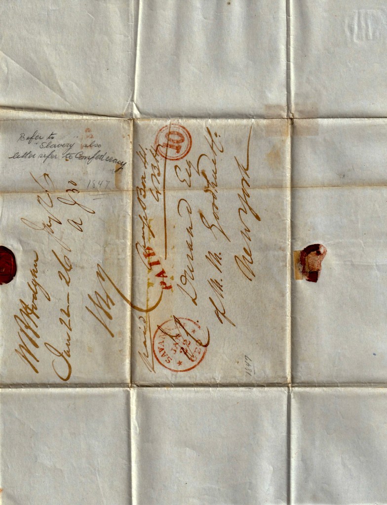 In this 1847 letter to his agent in NYC, Mr. Durand, William Brown Hodgson (1801-1871), an African ethnologist, who had several years previously married Georgia Telfair, the youngest daughter of Georgia Governor Edward Telfair, flaunts his new wealth and states his disapproval of abolitionist legislation being entertained in Congress: “We are ready for a Southern Confederacy rather than submit to have our property stigmatized.” In doing so, he presages the beginning of the Civil War, not to take place for another 14 years.