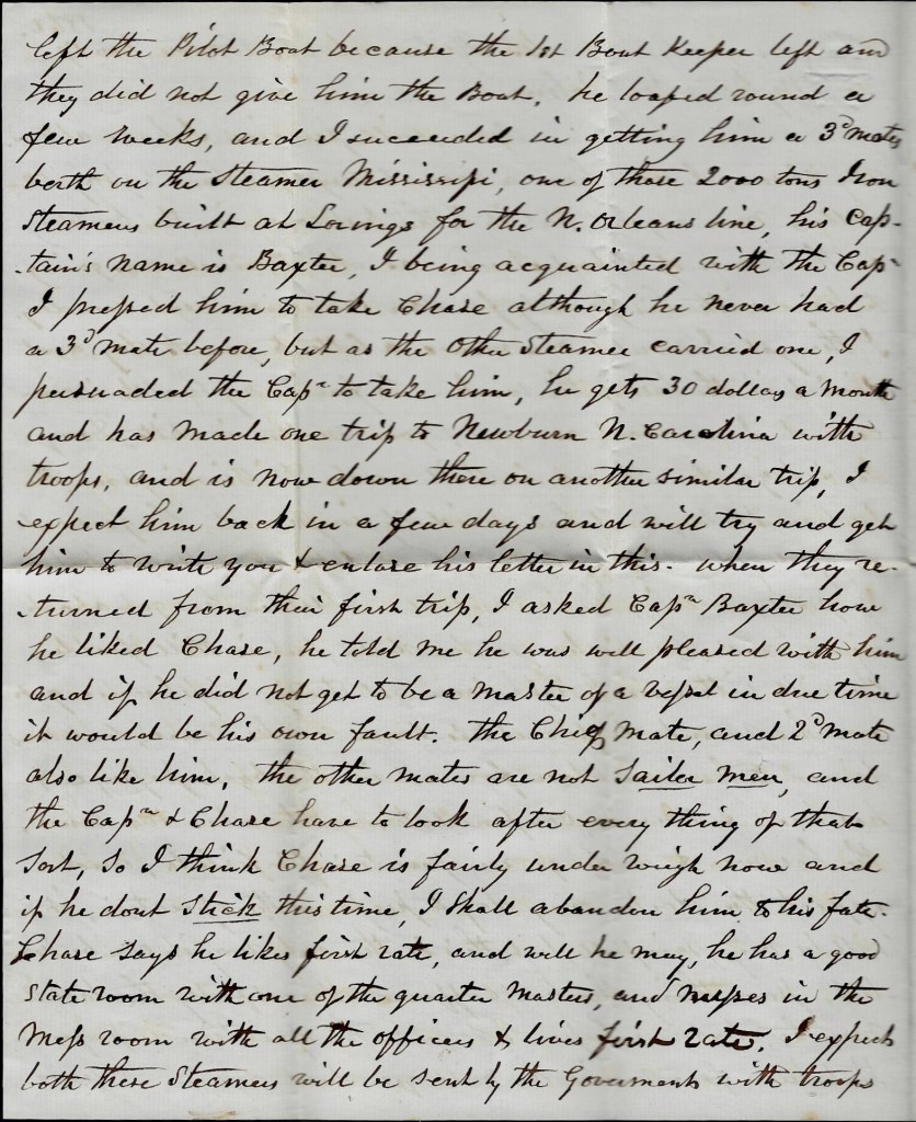 Chase left the pilot boat because the 1st boat keeper left and they did not give him the boat. He loafed round a few weeks and I succeeded in getting him a 3rd Mates berth on the steamer Mississippi—one of the 2,000 ton iron steamers built at Loring’s for the New Orleans line. His captain’s name is [Charles H.] Baxter. 1 I being acquainted with the captain, I pressed him to take Chase although he never had a 3rd Mate before. But as the other steamers carried one, I persuaded the captain to take him. He gets 30 dollars a month and has made one trip to New Bern, North Carolina with troops and is now down there on another similar trip. I expect him back in a few days and will try and get him to write you & enclose his letter in this.
