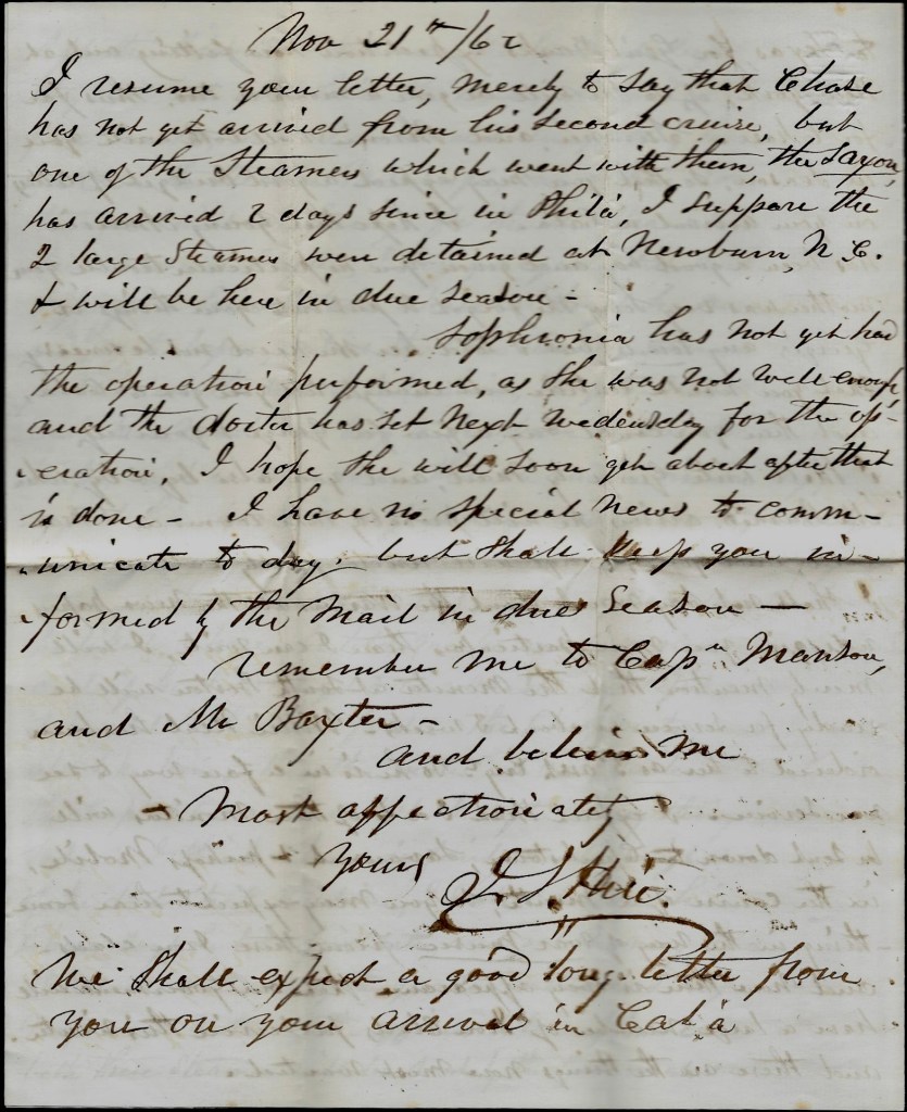 I resume your letter to say that Chase has not yet arrived from his second cruise but one of the steamers which went with them—the Saxon—has arrived two days since in Philadelphia. I suppose the 2 large steamers were detained at New Bern, N. C. & will be here in due season.