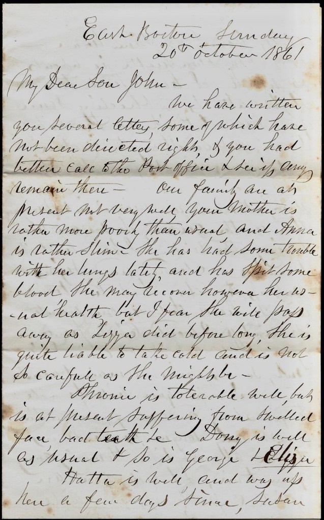 We have written you several letters, some of which have not been directed right, & you had better call to the post office & see if any remain there. Our family are at present not very well. Your mother is rather more poorly than usual, and Anna is rather slim. She has had some trouble with her lungs lately and has spit some blood. She may recover, however, her usual health but I fear she will pass away as Lizzie did before long. She is quite liable to take cold and is not so careful as she might be.