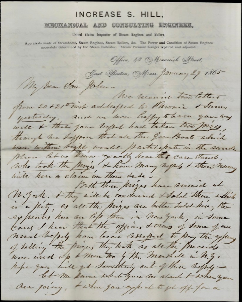 We received two letters from 20th & 21st inst. addressed to Phronia & Sum[ner[ yesterday and we were happy to learn you were well and that your vessel had taken two prizes though we suppose that all the gunboats which were within sight would participate in the awards. Please let us know exactly how this case stands, who took the prizes, and how many vessels & their names will have a claim on them, &c. &c.