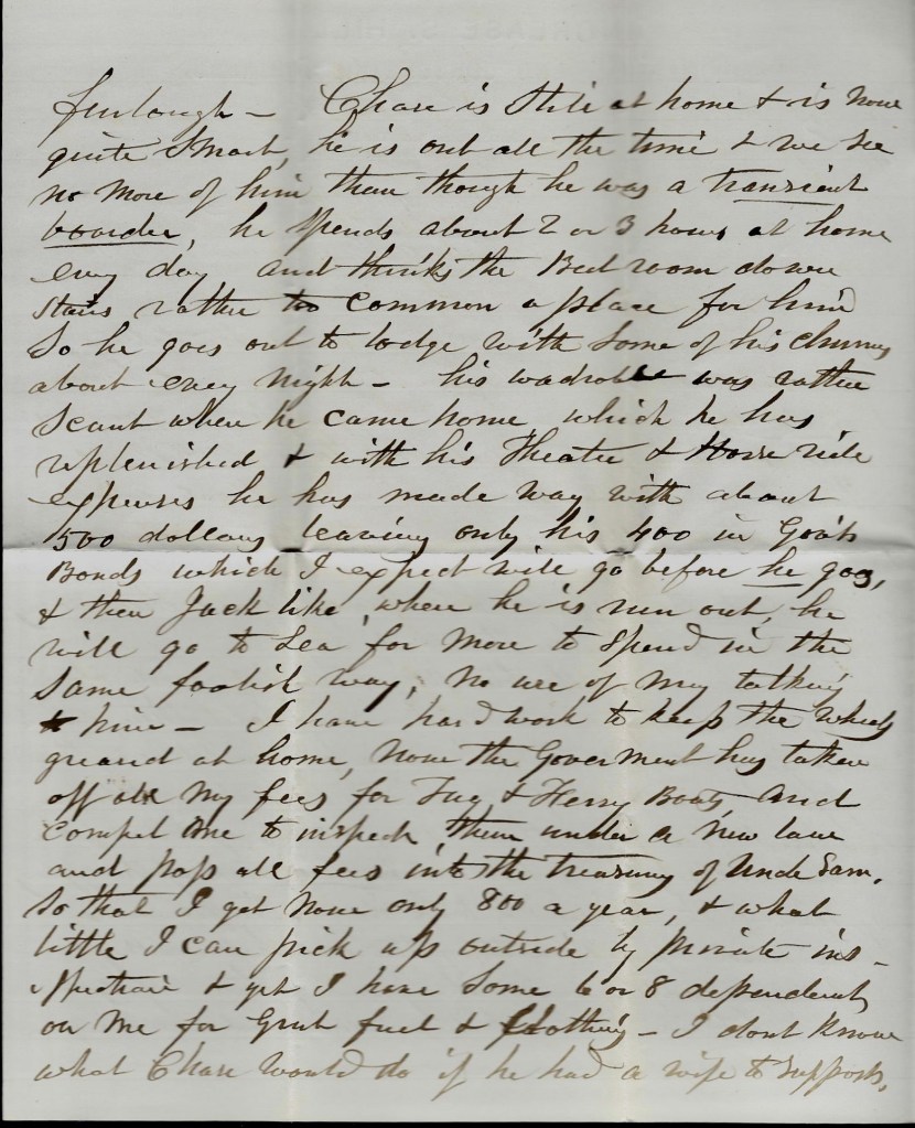 Chase is still at home & is ow quite smart. He is out all the time & we see no more of him than though he was a transient boarder. He spends two or three hours at home every day and thinks the bedroom downstairs rather too common a place for him so he goes out to lodge with some of his chums about every night. His wardrobe was rather scant when he came home which he has replenished & with his theatre & horse ride expenses, he has made way with about 500 dollars, leaving only his 400 in government bonds which I expect will go before he goes & then Jack -like, when he is run out [of money], he will go to sea for more to spend in the same foolish way. No more of my talking about him. 1