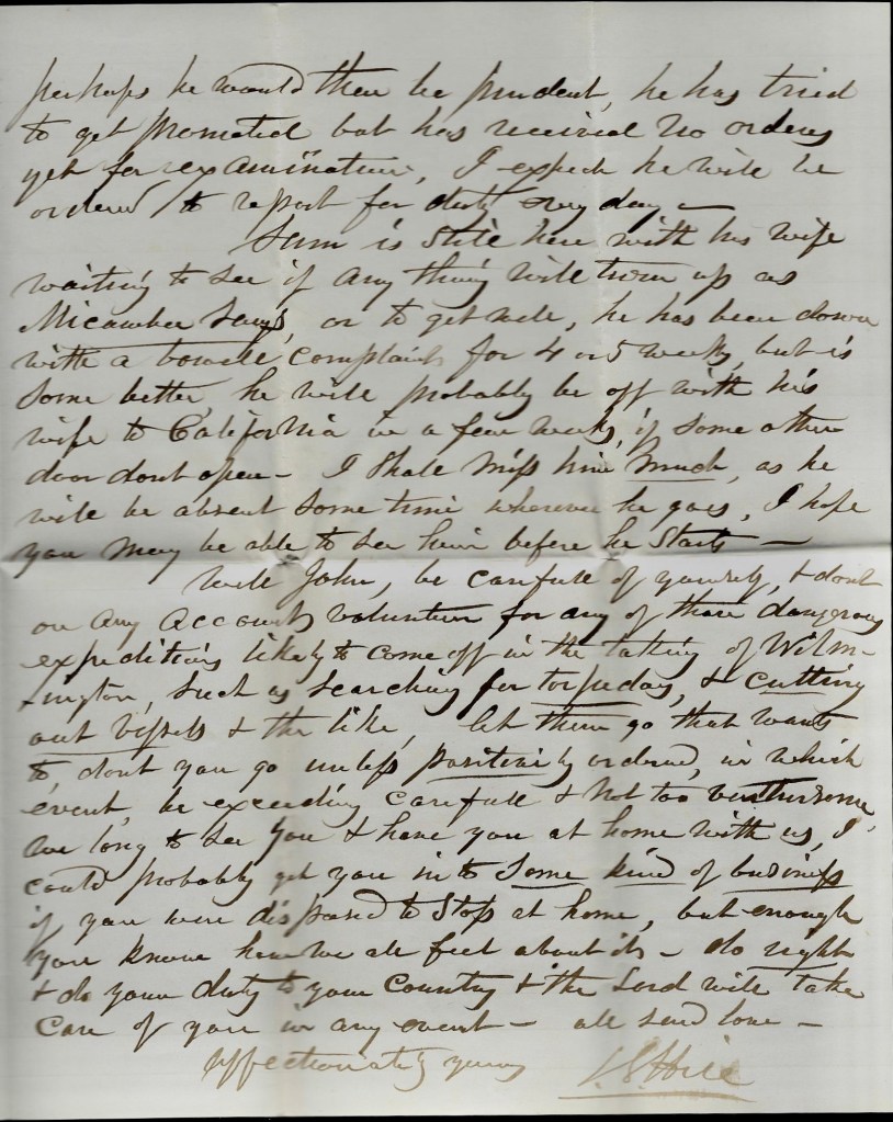 Well, John, be careful of yourself & don’t on any account volunteers for any of those dangerous expeditions likely to come off in the taking of Wilmington, such as searching for torpedoes & cutting out vessels & the like. Let them go that wants to. Don’t you go unless positively ordered, in which even be exceedingly careful & not too venturesome. We long to see you and have you at home with us. I could probably get you into some kind of business if you were disposed to stop at home, but enough. You know how we all feel about it. Do right and do your duty to your country & the Lord will take care of you in any event. All send love. Affectionately yours, — I. S. Hill