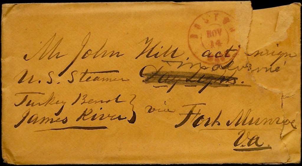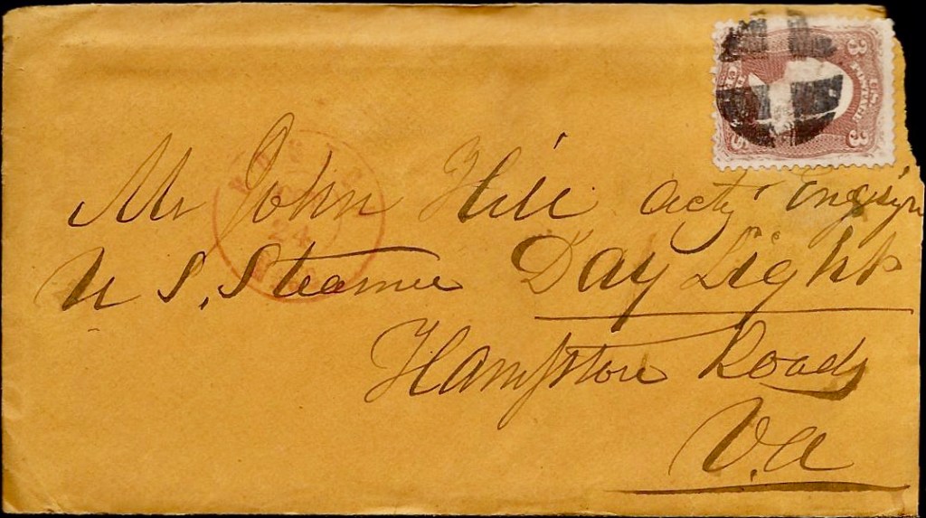1 Stephen “Chase” Hill (1841-1903) was working as a pilot in Boston Harbor when he was only 19 years old. From these letters we learn that he shirked responsibility and resorted to sea duty whenever he needed to make money. During the Civil War he enlisted on 13 May 1863 as Acting ensign in the US Navy and was assigned to the crew of the “Water Witch.” He was aboard the ship when she was boarded and taken captive almost without a fight by Confederates in June 1864. He was wounded and taken prisoner by the Confederates but exchanged later in 1864. He resigned his commission on 25 April 1865. In 1870, he was still enumerated in his parents East Boston residence, still single and employed as a “mariner.” He was married to Emma Laura Gay (1855-1920), the daughter of Charles Royal Gay and Laura A. Young, sometime in the late 1870s and in the 1880 Census, he was enumerated on Liverpool Street in Boston, working as a “Ship Keeper.” By that time, he and Emma had a young daughter named Laura M. Hill, age 1. Stephen died in 1903 at the Home for Disabled Soldiers in Togus, Kennebec county, Maine, where he was buried. His admission papers at the Home indicate that he had received a “gunshot wound in his right side on June 3rd 1864.” When he entered the Home in September 1891, he was 50 years old, stood 5’10” tall, had blue eyes and gray hair. He told them he was an “Engineer” by profession and that he was married and had been living in Wollaston, Massachusetts, just before admitting himself to the Home. He gave his brother John Hill of Dorchester, Massachusetts as nearest relative.