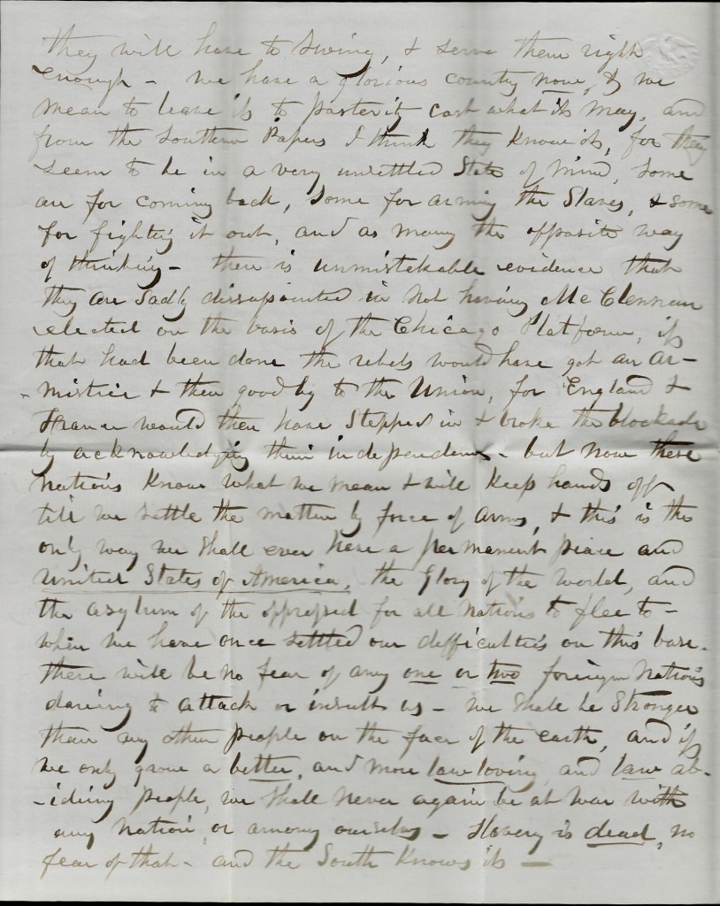 We have a glorious country now & we mean to leave it to posterity cost what it may, and from the Southern papers I think they know it for they seem to be in a very unsettled state of mind. Some are coming back. Some for arming the slaves, and some for fighting it out, and as many the opposite way of thinking. There is unmistakeable evidence that they are sadly disappointed in not having McClellan elected on th basis of the Chicago Platform. If that had been done, the rebels would have got an armistice & then goodbye to the Union, for England and France would then have stepped in & broke the blockade by acknowledging their independence. But now these nations know what we mean & will keep hands off till we settle the matter by force of arms, & this is the only way we shall ever have a permanent peace and United States of America—the glory of the World, and the asylum of the oppressed for all Nations to flee to.