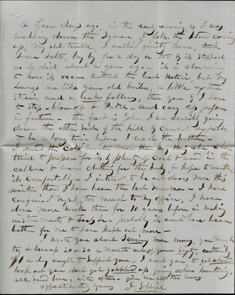 A few days ago, in the early evening as I was walking down the square, I felt the blood coming up—my old trouble. I walked quietly home, took some salts, lay by for a day or two, and it stopped as it did a year ago. It is alarming to have it occur without the least notice but my lungs are like your old boiler—a little extra strain and a leak follows. The you and I have to stop, blow off and patch, and carry less pressure in future. The fact is, John, I am sensibly ging down the other side of the hill and consequently expect to be a long time before I reach the bottom. I dread the cold winter more than anything else & have tried to prepare for it by plenty of coal and wood in the cellar and war clothing for the body, & hope to weather it comfortably. I intend to be outdoors more this winter than I have been the last summer. I have confined myself too much to my office. I have done more work than for 10 years before in making instruments and tools, &c. Probably it would have been better for e to have kept out more.