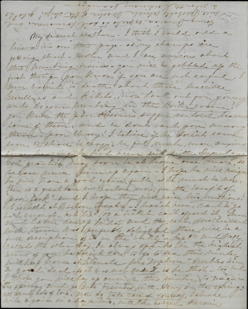 My dearest brother—I think I could add a line or two in this page as my stamps are getting short. Mother and I are anxious about this hunting business. You will be gobbled up the firs thing you know if you are not careful. I am worried to death about those horrible guerrillas and Rebels. Now look out for yourself and do your hunting in the boiler room! You know the poor prisoners suffer untold horrors some of them, and we don’t want you among them. Poor Chasy! I believe if he doesn’t come soon, he shall be crazy. We feel must more anxious since hearing he had been sick with dysentery. God grant he may soon be home once more so we can nurse him up again. I hope he will reign. He will have a good excuse, feeble as he must be now.
