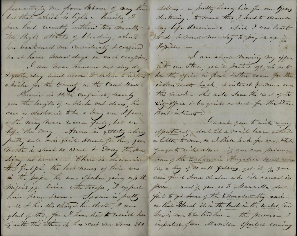 I want you to write every opportunity. Don’t let a mail leave without a letter to me as I shall look for one. And tell George to write also. If you can procure some of the California Angelica sweet wine—say a keg of 10 or 15 gallons—get it if you can find some dealer who will warrant it pure, and if you go to Manilla, don’t fail to get some of the chocolate they raise on that island, It is the best in the world and there is none to be had here. The preserves I imported from Manilla spoiled coming out. They were not put up well. They were called lemoncetas.