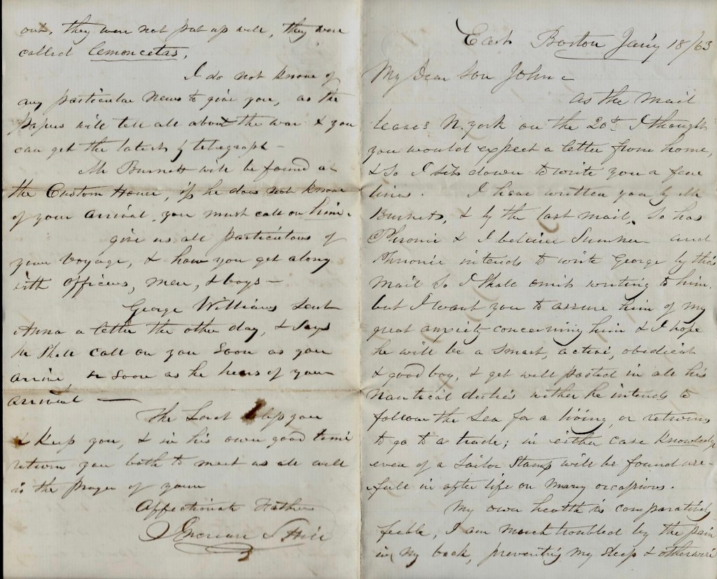 As the mail leaves New York on the 20th, I thought you would expect a letter from home & so I sit down to write you a few lines. I have written you by Mr. Burnett & by the last mail. So has Phronia & I believe Sumner and Phronia intends to write George by this mail so I shall omit writing to him. But I want you to assure him of my great anxiety concerning him & I hope he will be a smart, active, obedient & good boy, & get well posted in all his nautical duties whether he intends to follow the sea for a living or return to go to a trade. In either case, knowledge even of a sailor stamp will be found useful in after life on many occasions.