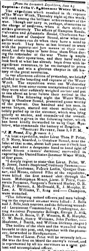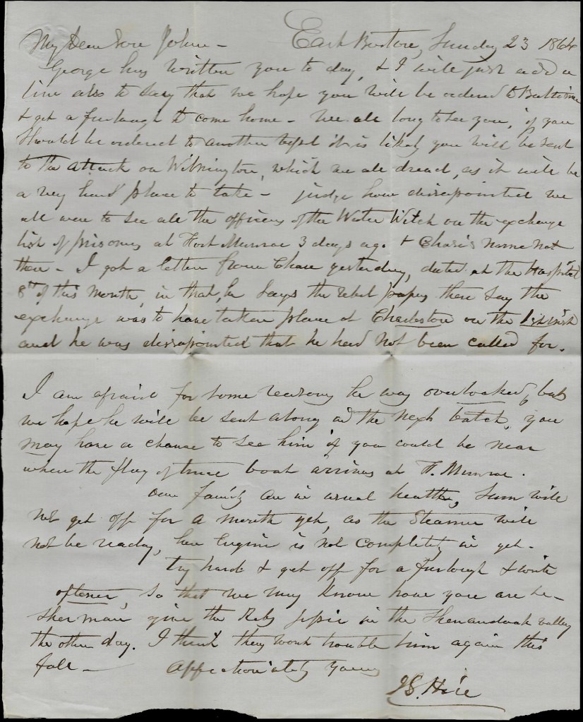Judge how disappointed we all were to see all the officers of the Water Witch on the exchange list of prisoners at Fort Monroe 3 days ago and Chase’s name not there. I got a letter from Chase yesterday dated at the hospital the 8th of this month. In that he says the Rebel papers there say the exchange was to have taken place at Charleston on the 1st inst. and he was disappointed that he had not been called for.