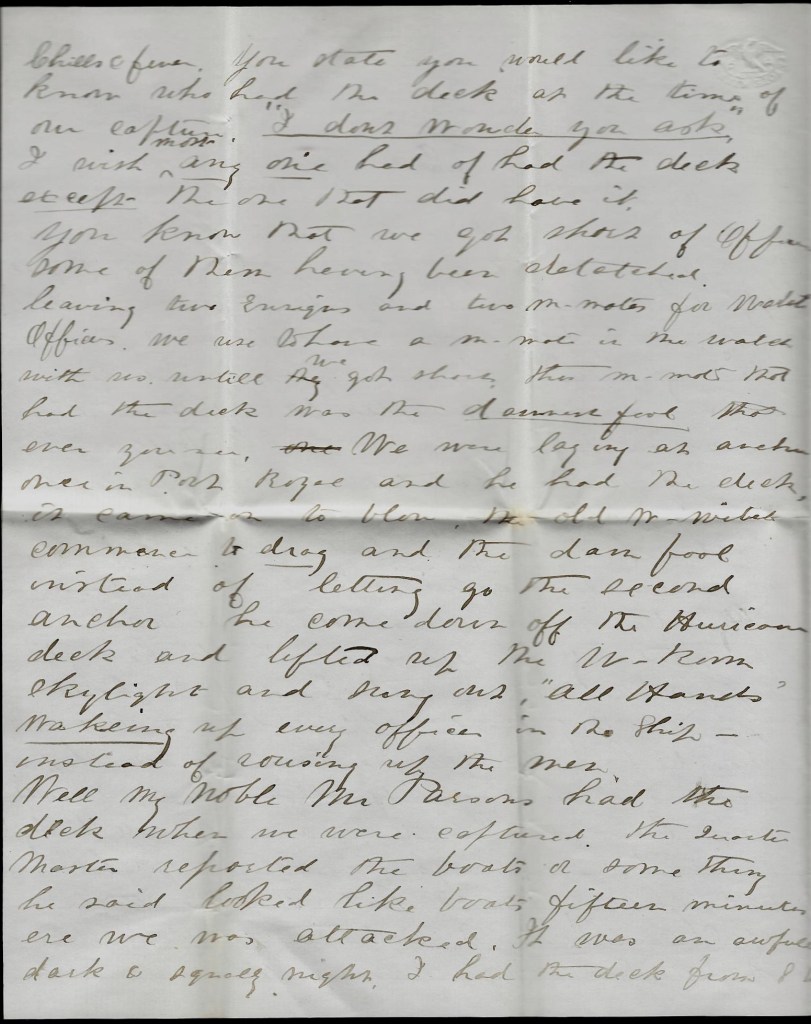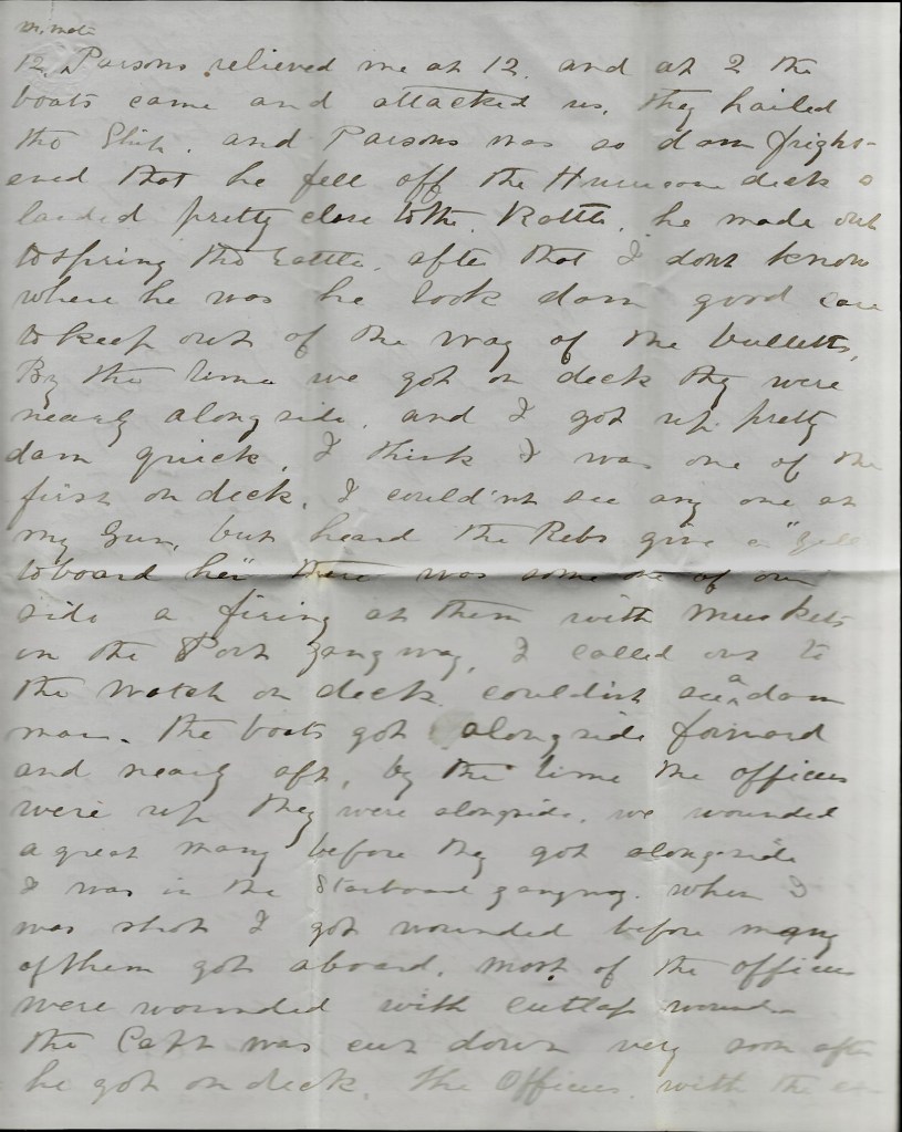 Well, my noble Mr. [Eugene D’W.] Parsons had the deck when we were captured. The quartermaster reported the boats or something he said looked like boats fifteen minutes ere we were attacked. It was an awful dark and squally night. I had the deck from 8 until 12 M. Parsons relieved me at 12 and at 2 the boats came and attacked us. They hailed the ship and Parsons was so damn frightened that he fell off the hurricane deck and landed pretty close to the rattle. He made out to spring the rattle. After that I don’t know where he was [but] he took damn good care to keep out of the way of the bullets.
