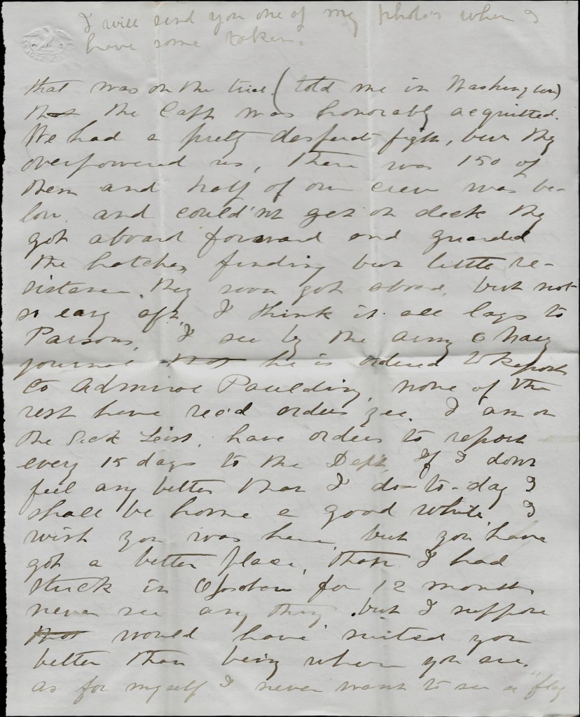 I have not seen Capt. [Austin Pendergrast] nor any of them except Mr. Weston. He was cut over the head. They tried the Capt. & Executive for [court martial]. I haven’t learnt the particulars yet but one of our men that was on the trial told me in Washington the Captain was honorably acquitted. We had a pretty desperate fight but they overpowered us. There was 150 of them and half of our crew was below and couldn’t get on deck. They got aboard forward and guarded the hatches. Finding but little resistance, they soon got aboard but not so easy aft. I think it all lays to Parsons. I see by the Army & Navy Journal that he is ordered to report to Admiral Paulding. 1 None of the rest have received orders to report yet. I am on the sick list [and] have orders to report every 15 days to the department. If I don’t feel any better than I do today, I shall be home a good while.