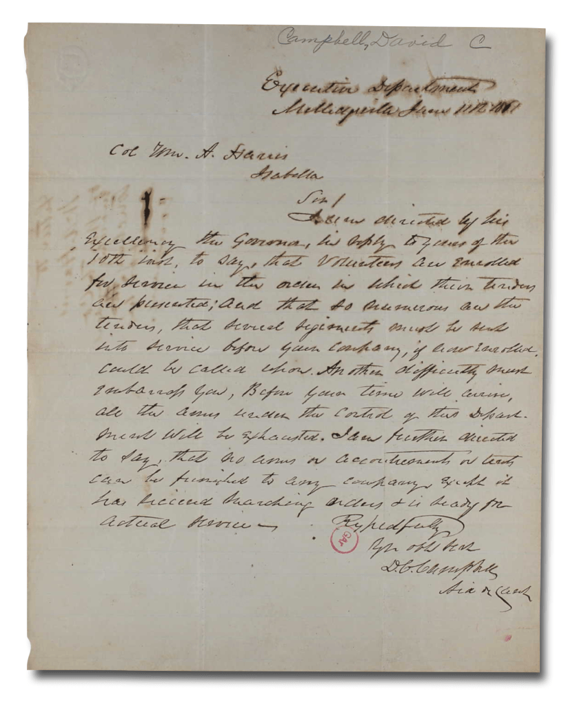 I am directed by his Excellency the Governor in reply to yours of the 10th inst., to say that Volunteers are enrolled for service in the order in which their tenders are presented; and that so numerous are the tenders that several regiments must be sent into service before your company, if [ ] enrolled, could be called upon. Another difficulty must embarrass you. Before your time will arrive, all the arms under the control of this Department will be exhausted. I am further directed to say that no arms or accoutrements or tents can be furnished to any company except it has received marching orders & is ready for actual service.