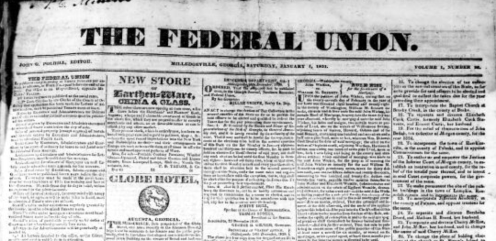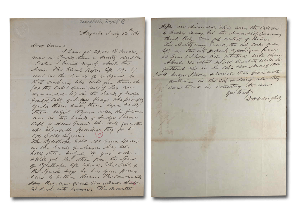 These letter were written by Col. David Crowell Campbell (1800-1862) who was married to Caroline Elizabeth “Eliza” Geddes Campbell (1804-1864)—a native of Charleston, South Carolina. David was a native of New Jersey and a graduate of Hamilton College, New York. Soon after completing his education, he moved to South Carolina, and for several years practiced law in partnership with the Hon. C. Y. Memminger, the distinguished Secretary of the Treasury of the Confederate States. About the year 1835 he changed his residence to Macon, Georgia, and soon afterwards represented the county of Bibb in the Legislature. He moved to Milledgeville, GA and in 1845 he became proprietor and Editor of the “Federal Union,” in which character he was a firm and zealous supporter of the Southern Rights Party in the contest of 1850-51. After the defeat of the Southern Rights ticket, he sold the office and devoted his time mainly to his valuable planting interests and to works of internal improvement connected with the seat of government.