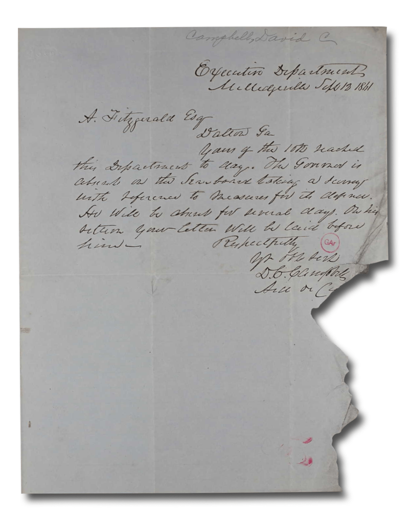 Though he retired from his editorial position, David continued to serve on the Georgia State Democratic Executive Committee. On November 22, 1860, the committee issued a call for a state secession convention, and Campbell was a delegate to that convention which of course voted for the ordinance of secession. From the following letters, we see that David served as an aide to the Governor, Joseph Emerson Brown, in the executive department early in the war. He died on the 4th of April 1862, however.