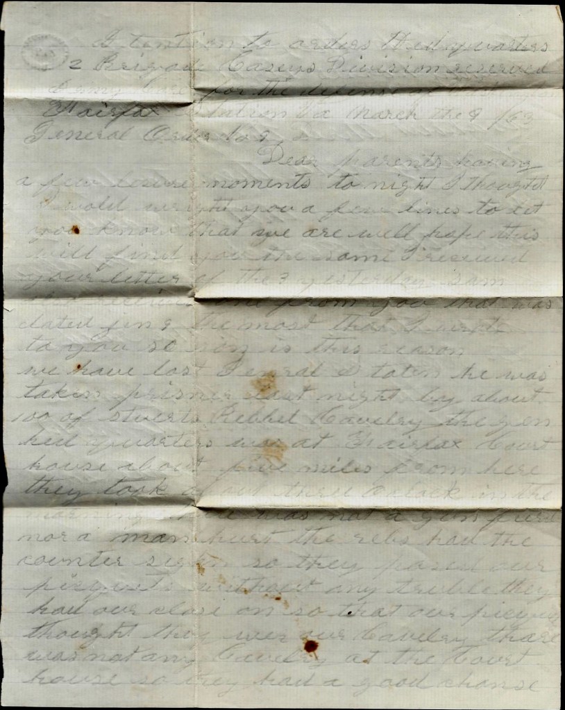Having a few leisure moments tonight, I thought I would write you a few lines to let you know that we are well. Hope this will find you the same. I received your letter of the 3rd yesterday. Sam also received one from you that was dated Feb. 9th. The most that I wrote to you so soon is this reason—we have lost General Staten [Edwin H. Stoughton]. He was taken prisoner last night by about 100 of [Jeb] Stuart’s rebel cavalry. The General’s headquarters was at Fairfax Court House about five miles from here. They took [him] about three o’clock in the morning. There was not a gun fired nor a man hurt. The rebs had the countersign so they passed our pickets without any trouble. They had our clothes on so that our pickets thought they were our cavalry. There was not any cavalry at the Court House so they had a good chance to work. They took about twenty horses, eight or ten prisoners, and one general. There is about three thousand cavalry after them today.