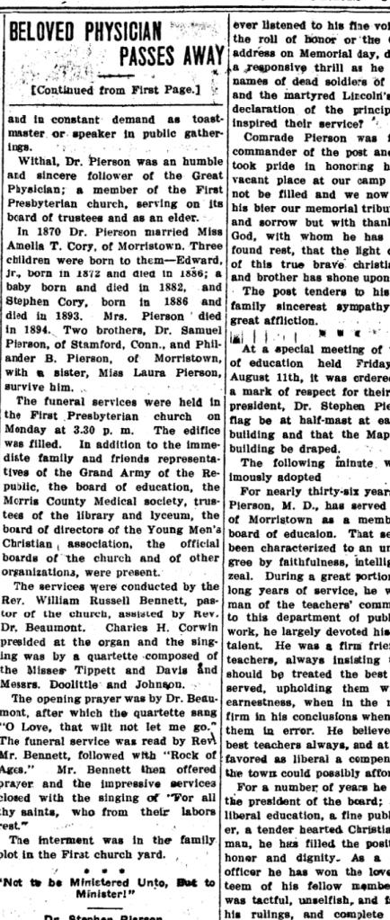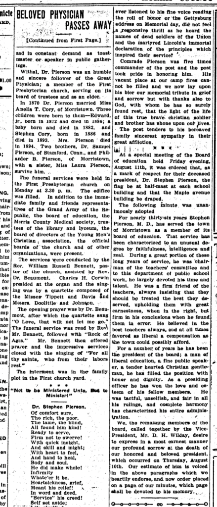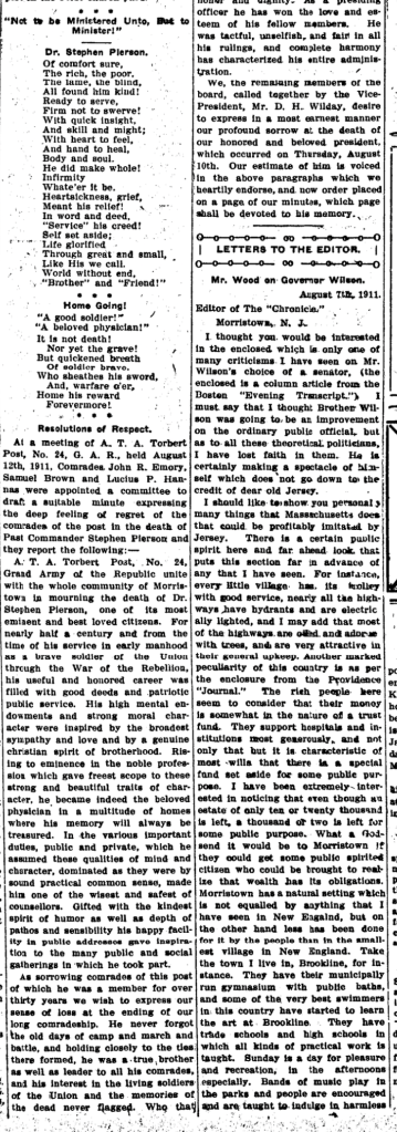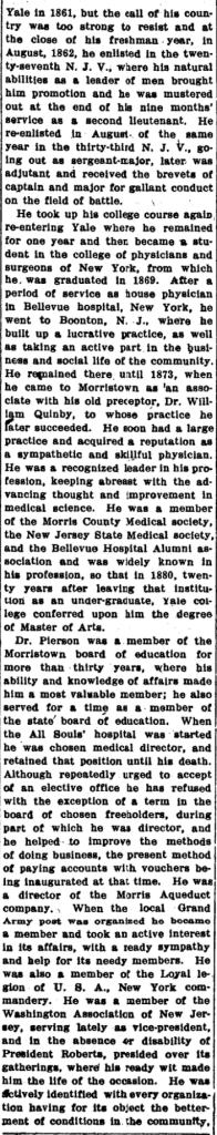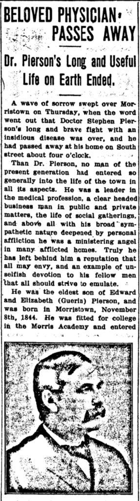 After he was discharged from the 33rd New Jersey, Stephen returned to college and “passed to the College of Physicians and Surgeons, graduating with such honors as to ensure his internship at Bellevue Hospital.” His obituary (below) includes more details on his life as a physician.