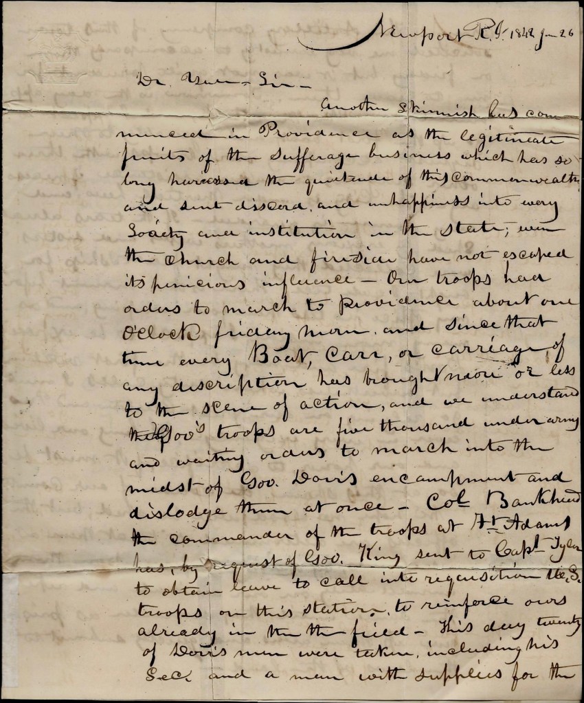 Most Americans today are probably not that familiar with Dorr’s Rebellion, particularly if they were not raised in Rhode Island. In a nutshell, it was an armed insurrection led by Thomas Wilson Dorr in Rhode Island between 1840 and 1842 with the objective of achieving greater suffrage in the state. The state lagged behind almost all of the other states in eliminating the land-holding requirement for suffrage incorporated in its colonial charter of 1663. With the industrial revolution and the migration of the population away from farms to urban areas, many men found they could not longer meet the land-holding requirement. As a result, by 1840, it is estimated that 60% of the male population were disenfranchised. With Dorr’s leadership, a People’s Convention was held that ratified a popular referendum and Dorr was elected governor under this document. The movement was only crushed militarily by Gov. King declaring marshal law and arresting its leaders, including Dorr, in June 1842 when this letter was written. Though the movement was stopped, it did initiate the drafting of a new constitution in Rhode Island that liberalized voting the following year. [See Dorr Rebellion/Rhode Island’s Very Own, Very Small Civil War by Justin Shatwell]