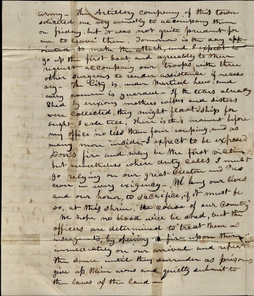 This day twenty of Dorr’s men were taken, including his Sec. and a man  with supplies for their army. The artillery company of this town solicited me very earnestly to accompany them on Friday, but it was not quite prudent for me to leave then. Tomorrow is the day appointed to make the  attack and I expect to go up the first boat and, agreeably to their request, accompany our troops with three other Surgeons to render assistance if necessary. The city is under martial law and every avenue is  guarded. If the tears already shed by anxious mothers, wives, and sisters were collected, they might float a ship for ought I can tell. There is this moment before my office no less than four weeping, and as many more  inside.