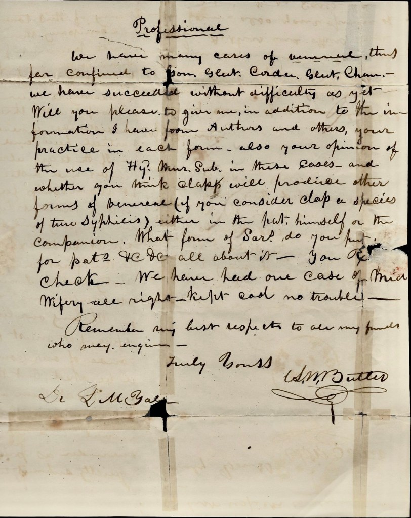 We have many cases of venereal [disease], thus far confined to Gon[orrhoea], Glut. Chordee, 1 Glut. Chlam[ydia]. We have  succeeded without difficulty as yet. Will you please to give me, in addition to the information I have from authors and others, your practice in each form – also your opinion of the use of Hyd Mur. Sub. in these cases, and whether you think clapp will produce other forms of venereal (if you consider clap a species of true  syphilis) either in the patient himself or the companion. What form of Sars. do you put for patients, &c, &c. all about  it. You Rx check. We have had one case of midwifery all right—kept cool no trouble.