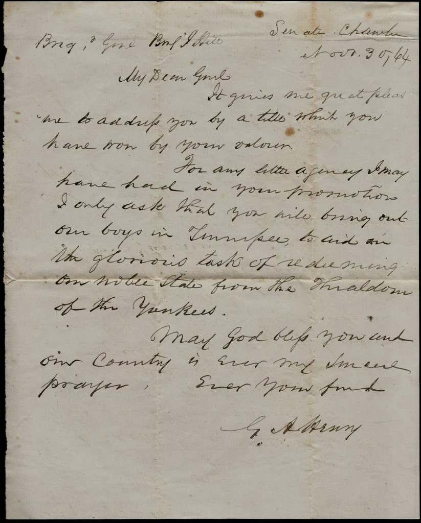 The letter was written to Brig. Gen. Benjamin Jefferson Hill (1825-1880), a successful merchant and Tennessee state senator from 1855 to 1861. Hill began his service as Colonel of the 5th Tennessee Volunteers and later as Colonel of the 35th Tennessee. After a long and illustrious record, he was promoted to brigadier general in 30 November 1864 (date of this letter) and tasked with organizing a mounted battalion on Northern Alabama to ride with Forrest’s Cavalry Corps.