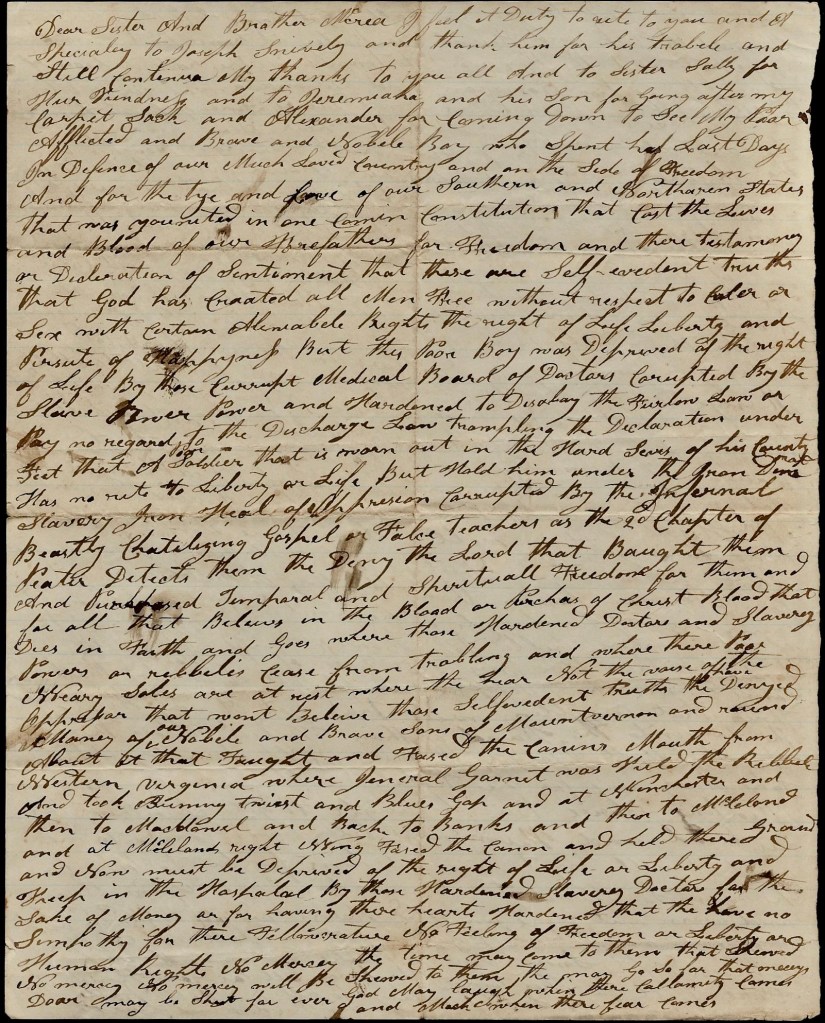 I feel a duty to write to you and especially to Joseph Snively and thank him for his trouble and still continue my thanks to you all and to sister Sally for her kindness and to Jeremiah and his son for going after my carpet sack and Alexander for coming down to see my dear afflicted and brave and noble boy who spent his last days in defense of our much loved country and on the side of freedom and for the tie and love of our southern and northern states that was united in one common constitution that cost the lives and blood of our forefathers for freedom and their testimony or declaration of sentiment that there are self-evident truths that God has created all men free without respect to color or sex, with certain inalienable rights—the right of life, liberty, and pursuit of happiness. But this poor boy was deprived of the right of life by those corrupt Medical Board of doctors, corrupted by the slave power, and hardened to disobey the furlough law or pay no regard to the discharge law, trampling the Declaration under feet that a poor soldier that is worn out in the hard service of his country has no right to liberty or life, but hold him under the Grand Dame Slavery iron veil of oppression, corrupted by the infernal, beastly, chattalizing gospel or false teachers as the 2nd Chapter of Peter directs them to deny the Lord that brought them and proposed temporal and spiritual freedom for them and for all that believe in the blood or purchase of Christ’s blood that dies in faith and goes from troubling and where their poor weary souls are at rest, where they hear not the voice of the oppressor that won’t believe those self-evident truths that have denied many of our noble and brave sons of Mount Vernon and round about that fought and faced the cannon’s mouth, from Western Virginia where General [Robert S.] Garnett was killed—the Rebel—and took Romney twice and Blue’s Gap, and at Winchester and then to McDowell and back to Banks, and then to McClellan, and at McClellan’s right wing faced the cannon and held their ground and now must be deprived of the right of life or liberty and kept in the hospital by those hardened slavery doctors for the sake of money or for having their hearts hardened that they have no sympathy for their fellow creatures—no feeling of freedom or liberty or human rights, no mercy. The time may come to them that showed no mercy [when] no mercy will be shown to them. They may go so far that mercy may be shut forever. God may laugh when the calamity comes and [ ] when the fear comes.