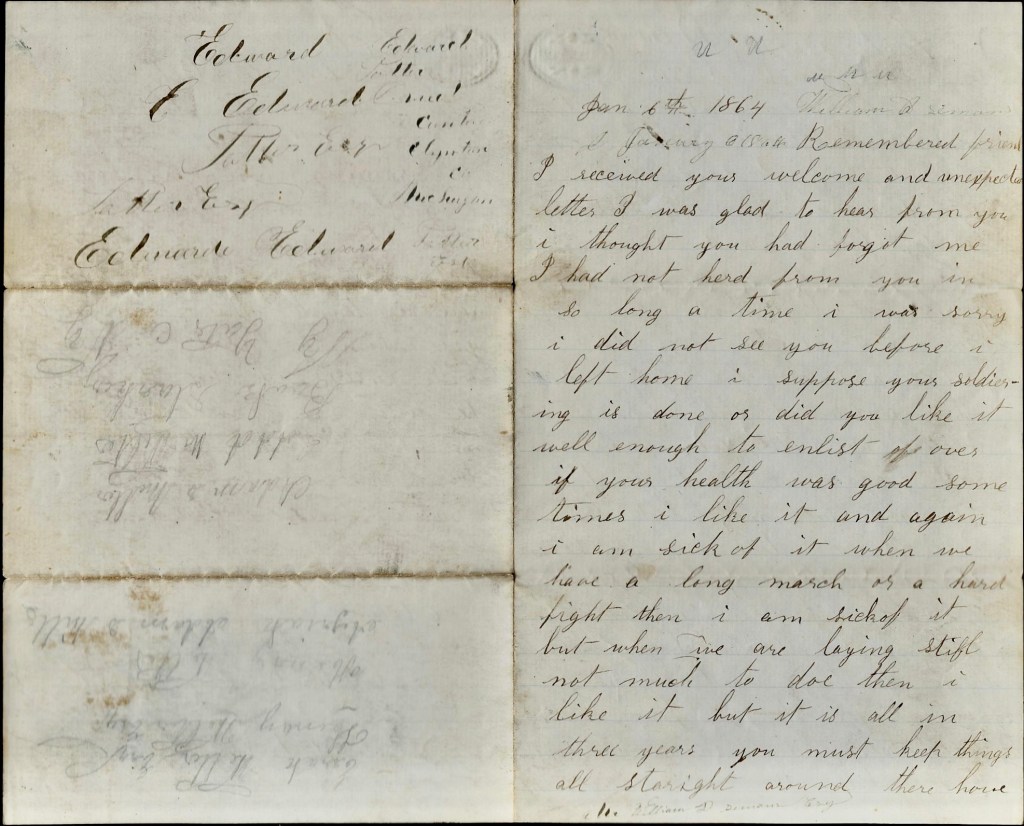 I received your welcome and unexpected letter. I was glad to hear from you. I thought you had forgot me, I had not heard from you in so long a time. I was sorry I did not see you before I left home. I suppose your soldiering is is done, or did you like it well enough to enlist over if your health was good? Sometimes I like it and again I am sick of it. When we have a long march or a hard fight, then I am sick of it. But when we are laying still [with] not much to do, then I like it. But it is all in three years.